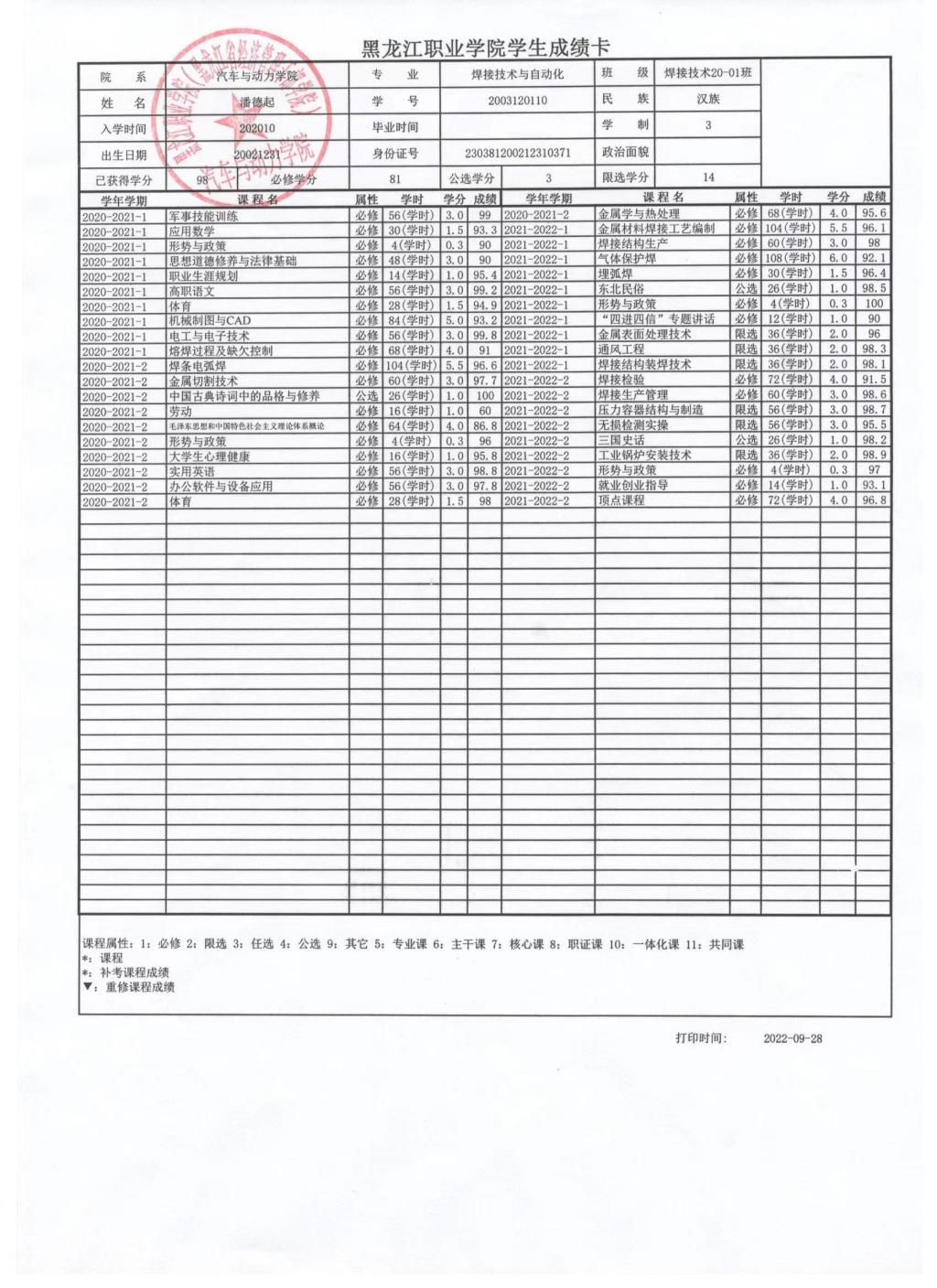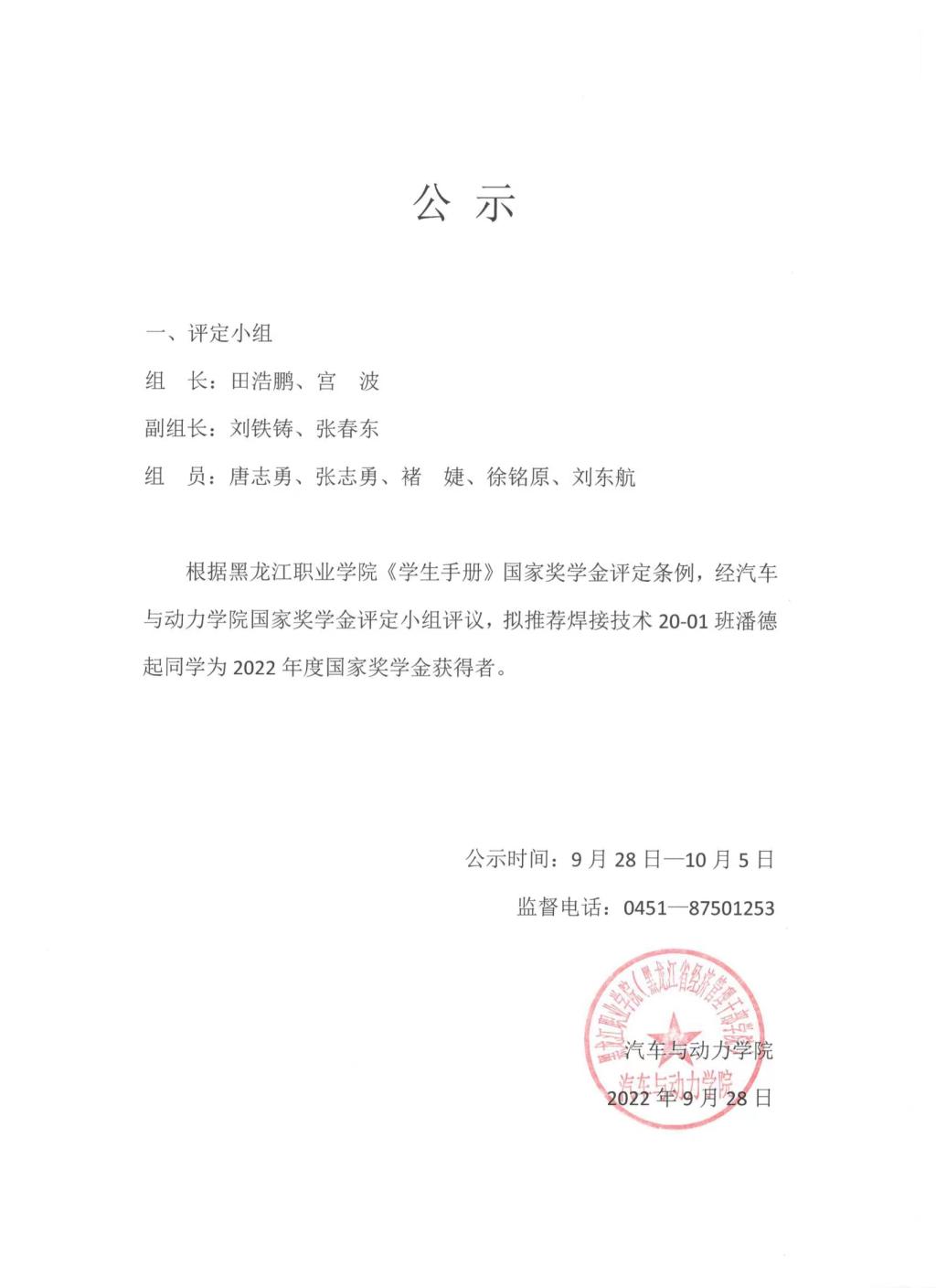 汽车与动力学院2022年度国家奖学金拟推荐人公示