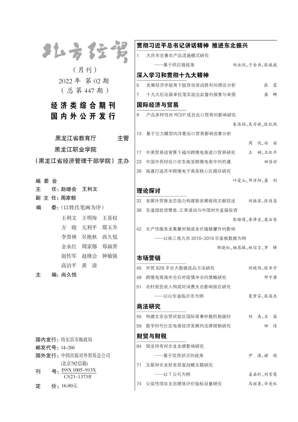 版权所有:北方经贸杂志社 地址:黑龙江省哈尔滨市南岗区学府路5号 邮编150080 电话:0451-86681276 86646778 邮箱:bfjmzzs@126.com