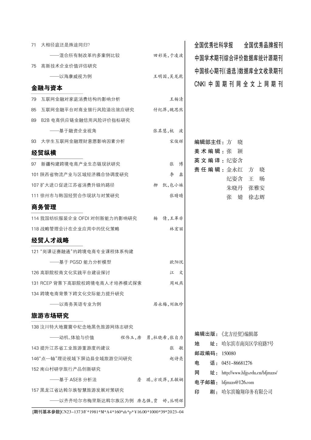 版权所有:北方经贸杂志社 地址:黑龙江省哈尔滨市南岗区学府路5号 邮编150080 电话:0451-86681276 86646778 邮箱:bfjmzzs@126.com