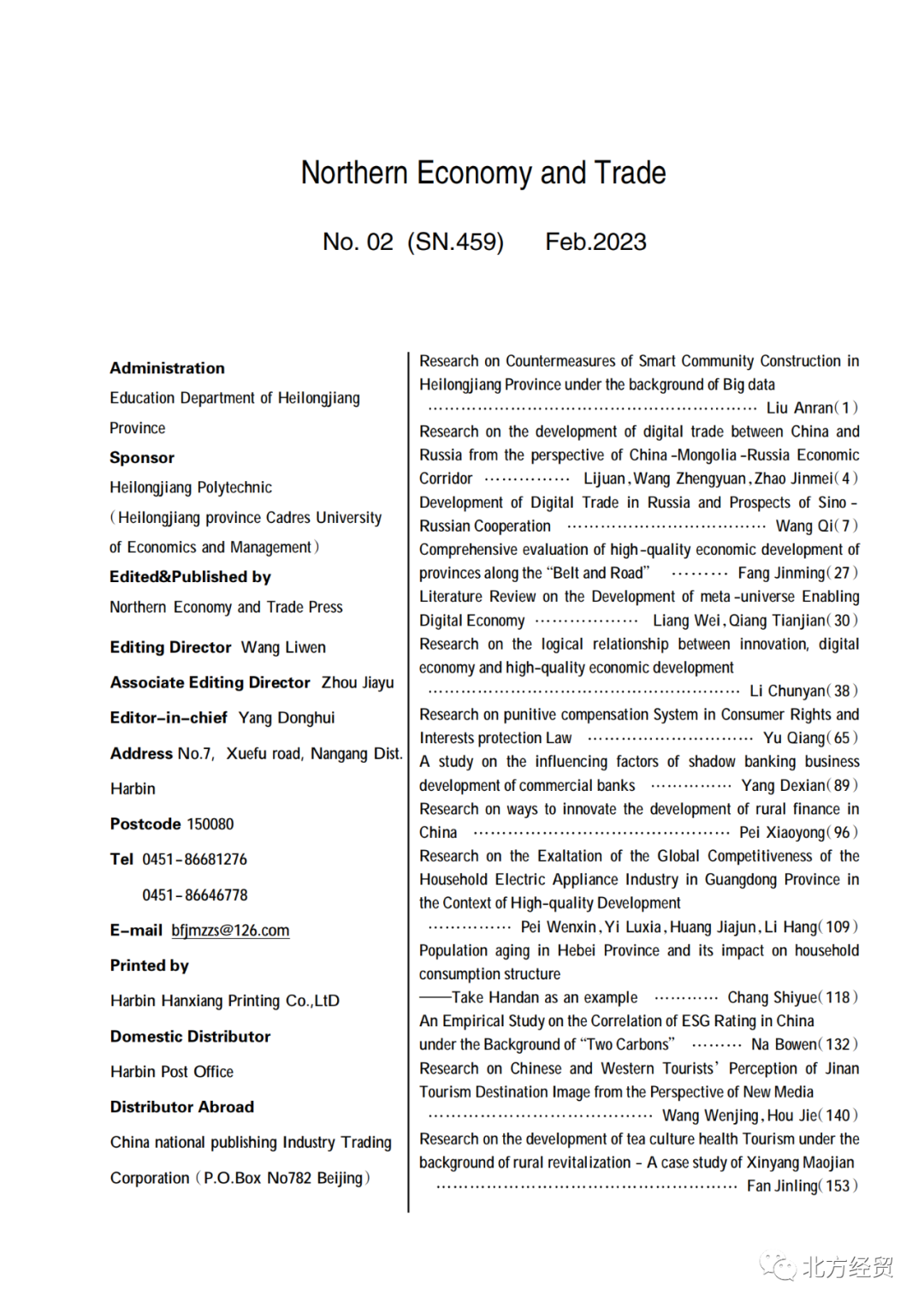 版权所有:北方经贸杂志社 地址:黑龙江省哈尔滨市南岗区学府路5号 邮编150080 电话:0451-86681276 86646778 邮箱:bfjmzzs@126.com