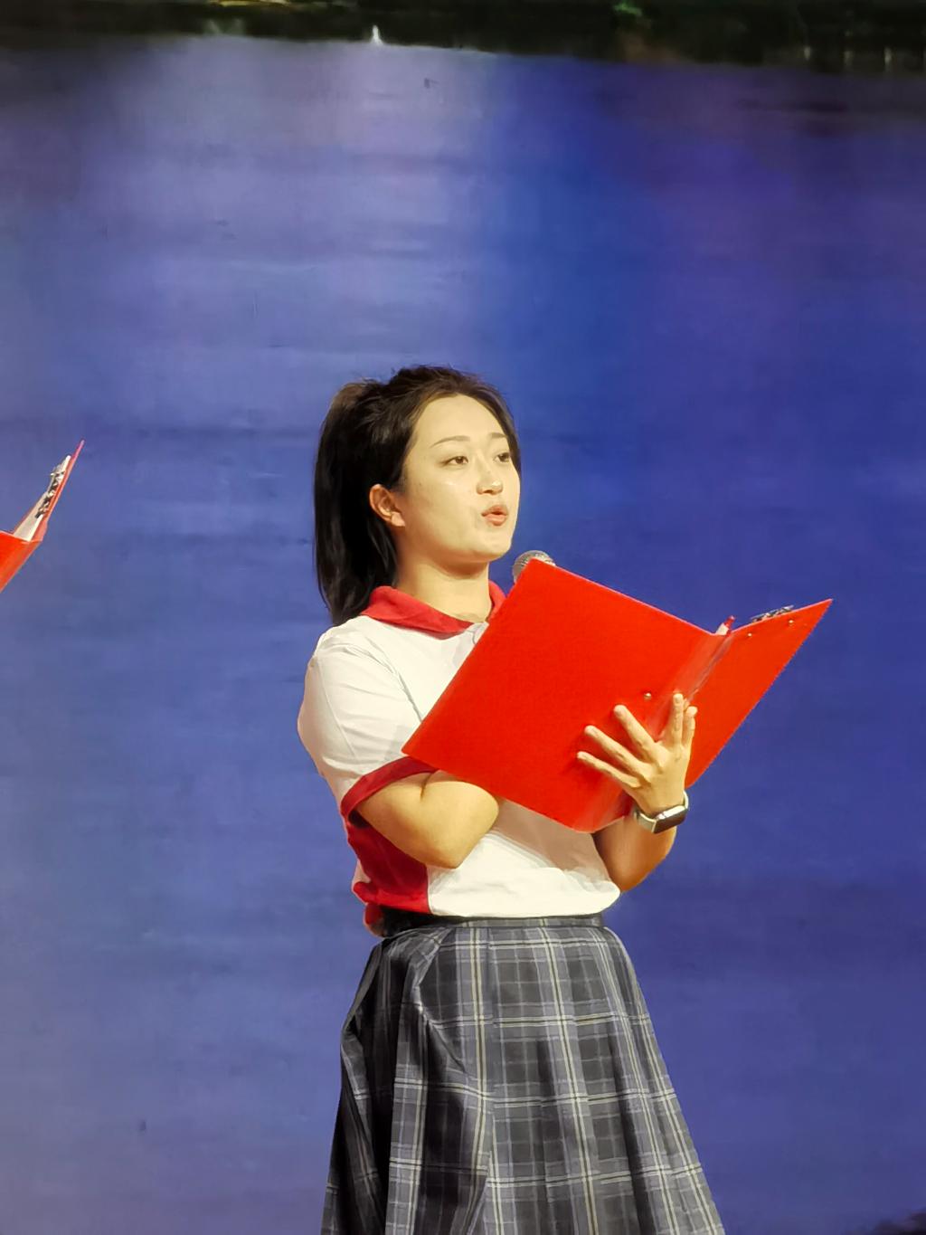 ▲朱晏枢同学与教师同台参加情境诗朗诵《赤子丹心耀边疆》的表演