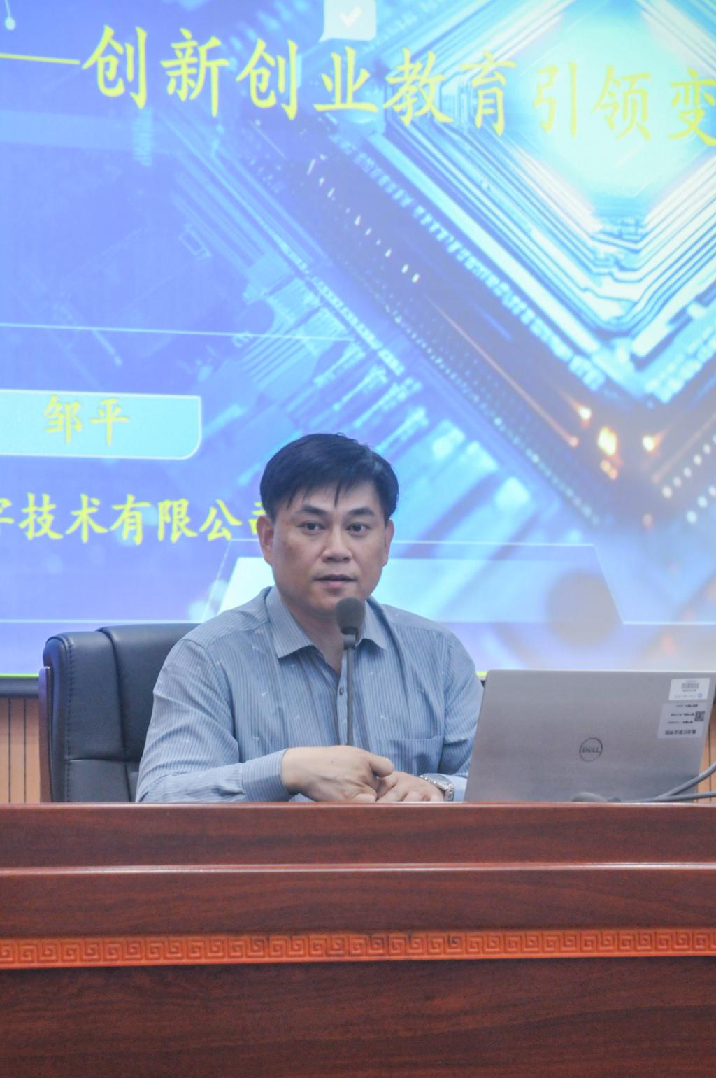 为推动AI 技术创新应用,助力新质生产力发展,为师生创新创业提供新思路,学校于 2025 年 4 月 23 日下午 13:30 在一校区工匠楼 11 楼会议室成功举办“赋能未来:人工智能展翅万亿新赛道——创新创业教育引领变革培训”讲座。黑龙江省天琪投资管理有限公司副总经理邹平主讲,一二校区共计200余人参加培训,讲座由创新与创业学院副院长朱晓丹主持。