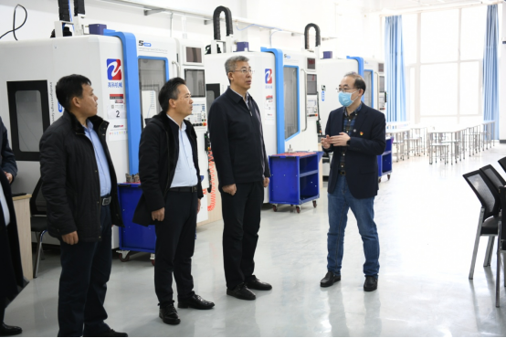 在王利文、王明海陪同下,考察团参观了贝博官网智能制造技术学院的工业中心、多轴加工实训室、增材制造实训室、数字化检测实训室、工业机器人训练中心和信息工程学院的华为认证VUE考试中心、虚拟现实工作室、录播室、大数据实训室。智能制造技术学院院长李子峰、信息工程学院院长张晓霖对实训室建设进行详细介绍。