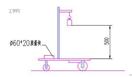 给定重力势能为5焦耳(取g=10m/s2),竞赛时统一用质量为1Kg的重块(¢50×65 mm,普通碳钢)铅垂下降来获得,落差500±2mm,重块落下后,须被小车承载并同小车一起运动,不允许掉落。
