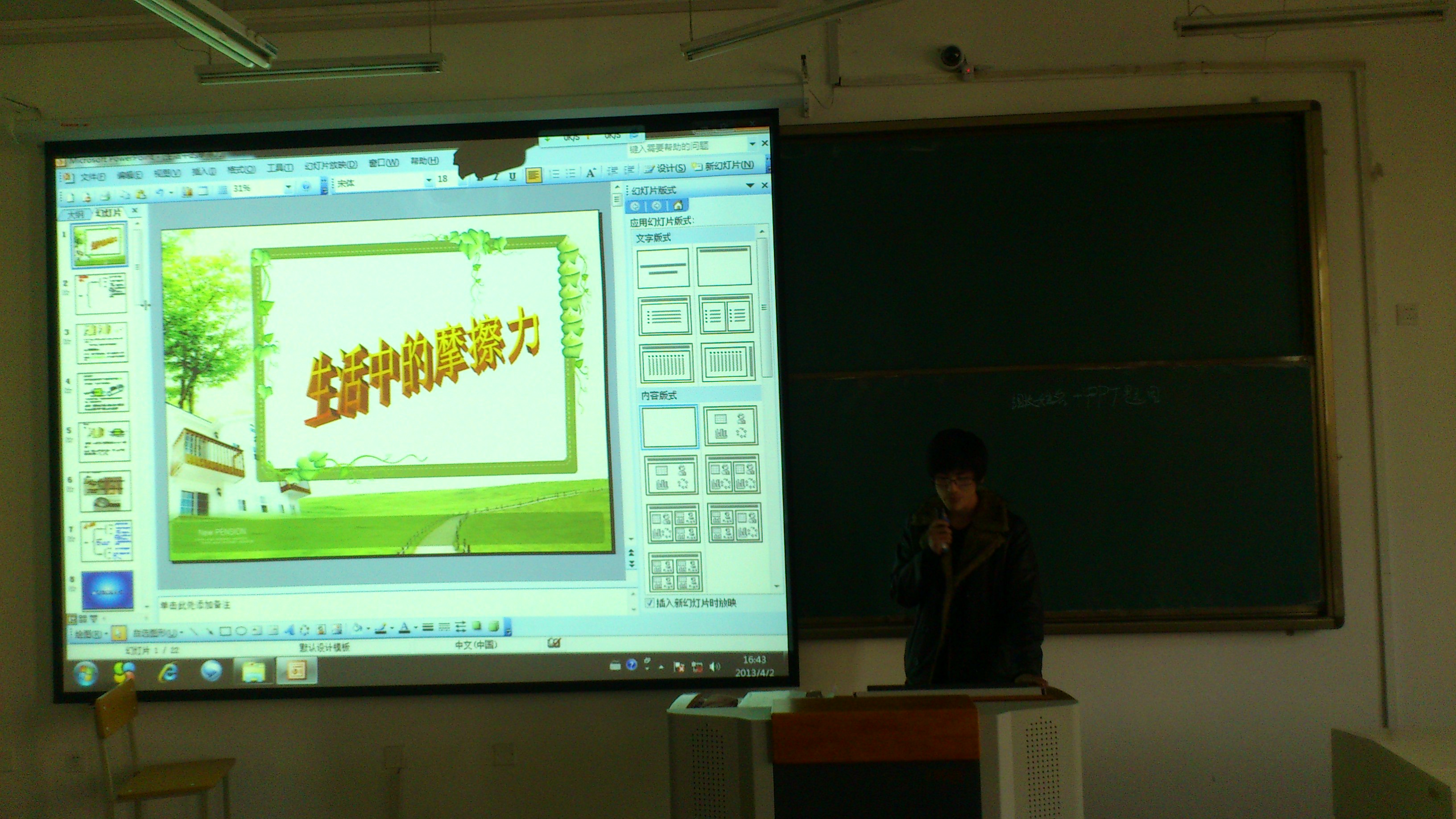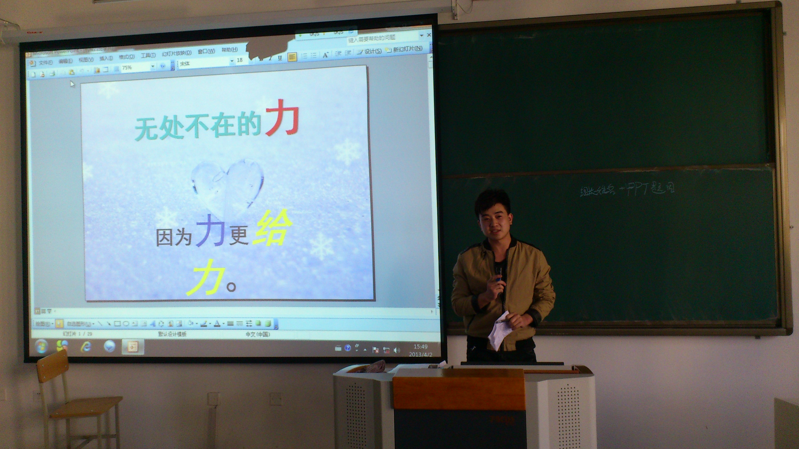 4月9日,2012级机械制造与自动化二班在《机械设计基础》课程中进行了以“力”为主题的课件展示活动。