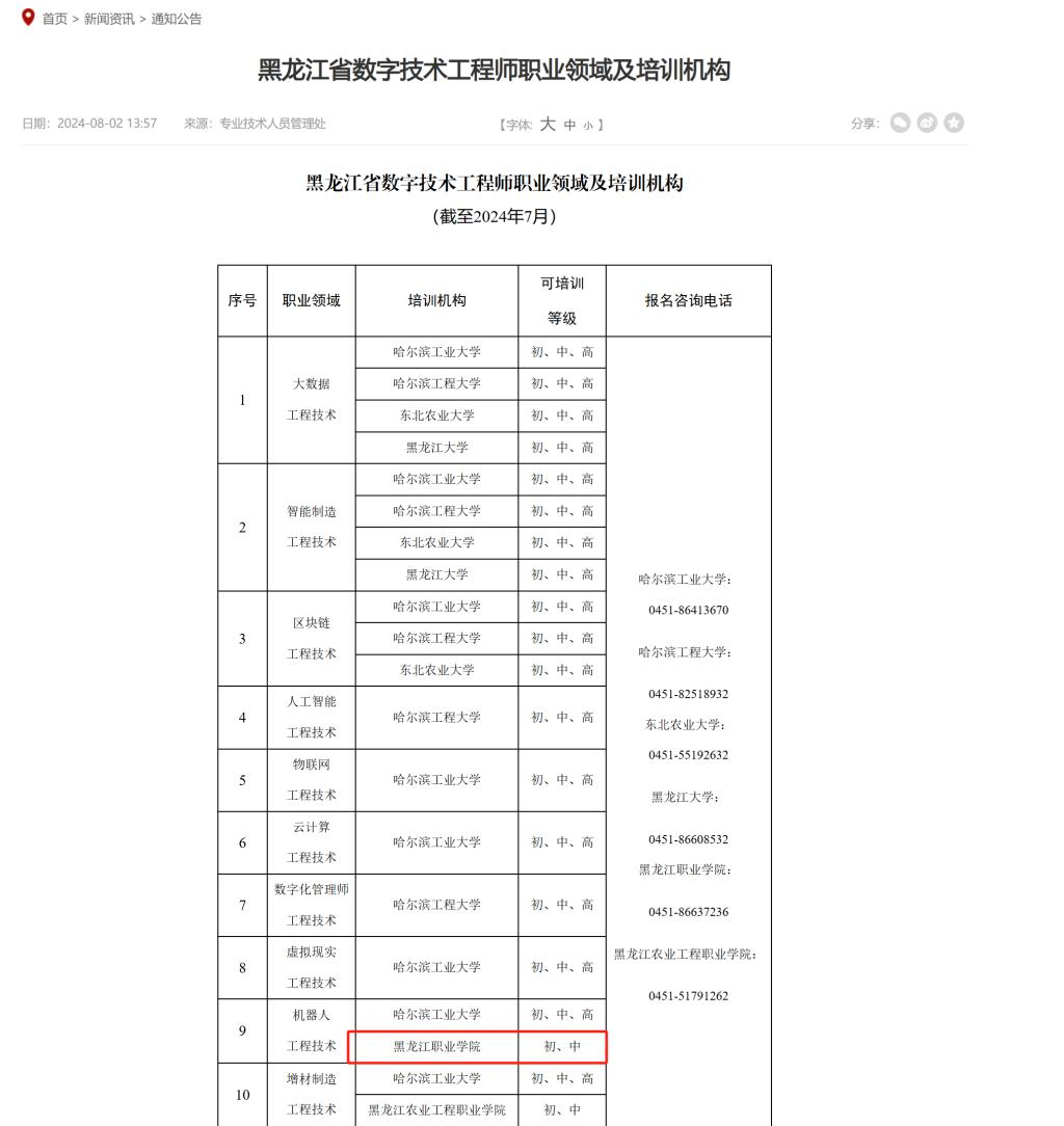 日前,黑龙江省人力资源和社会保障厅公布了黑龙江省第三批数字技术工程师培训机构名单,贝博官网工业机器人技术专业一直致力于育训结合人才培养,将学历教育和职业培训相结合,发挥高职院校人才培训职能,团队凭借扎实的专业实力与丰富的培训经验以及先进的专业设备设施积极参与申报,助力贝博官网获批成为机器人工程技术人员(初级、中级)培训机构。本次学校获批成为黑龙江省数字技术工程师培训机构,体现了政府、社会对贝博官网办学实力和办学成效的肯定。