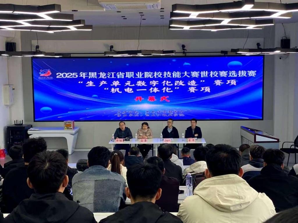 2025年4月25日下午,由省教育厅主办、BB贝博艾弗森官方网站承办2025年黑龙江省职业院校技能大赛暨世校赛选拔赛“生产单元数字化改造”和“机电一体化”赛项在贝博官网智能制造技术学院虚拟仿真实训基地开幕,来自全省13支参赛队伍、58名选手参加了开幕式。智能制造技术学院院长李子峰、省教育厅委派监督仲裁员山颖、生产单元数字化改造赛项裁判长冯晓宁、智能制造技术学院徐伟等同志参加了开幕式。