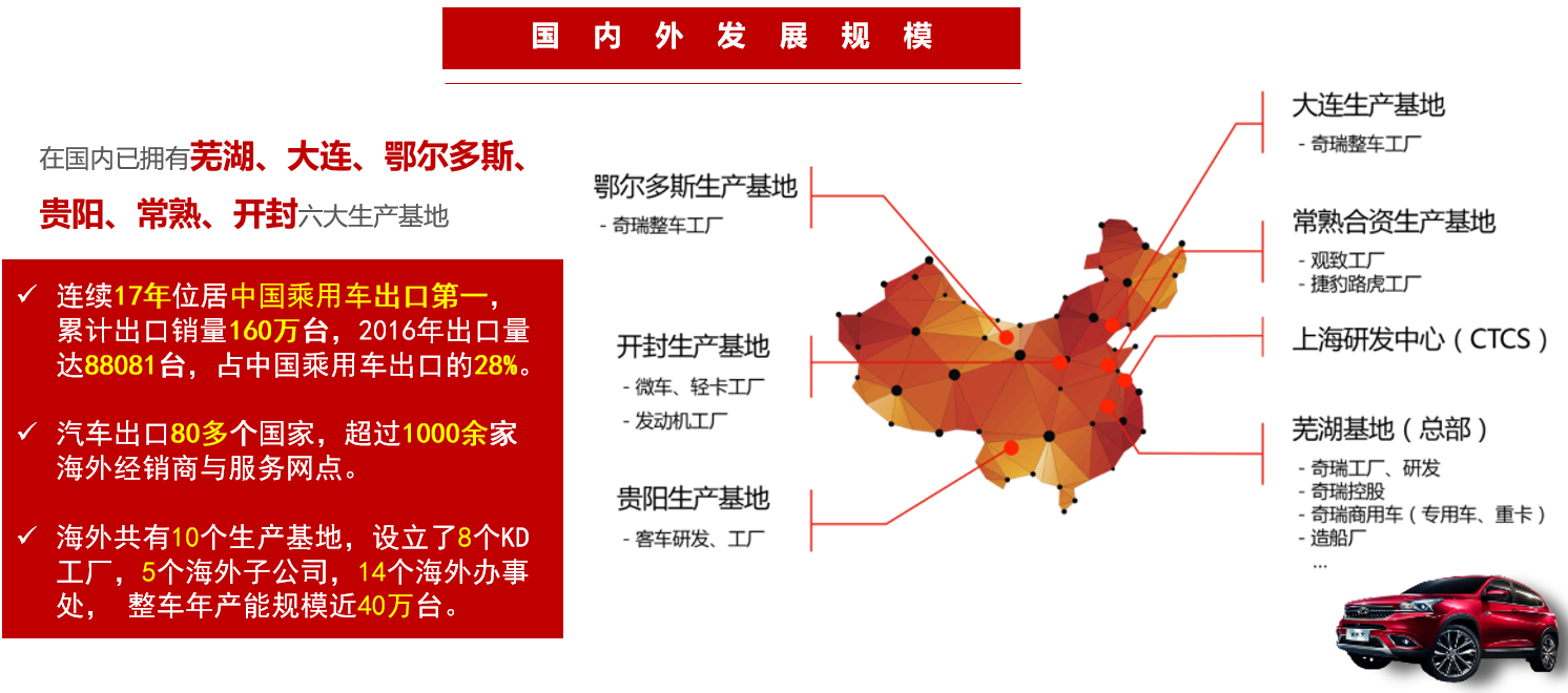 坚持“技术立企”是奇瑞汽车发展战略的核心,打造“国际知名品牌”是奇瑞汽车的战略发展目标。奇瑞汽车一切以用户为中心,始终坚持自主创新,致力于为全球消费者带来高品质汽车产品和服务体验。