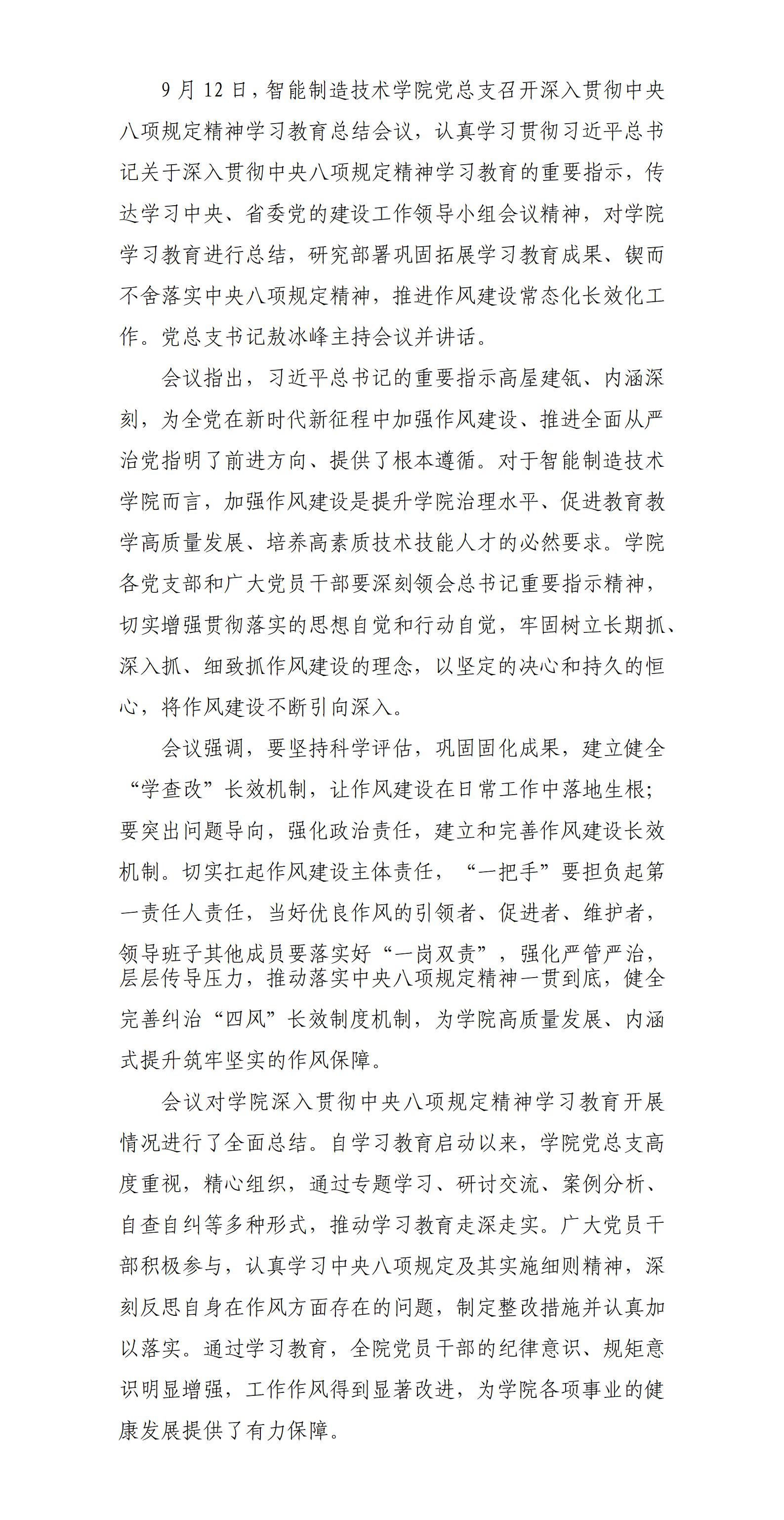 智能制造技术学院党总支召开深入贯彻中央八项规定精神学习教育总结会议