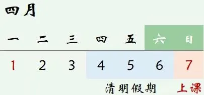2024年4月4号~4月6号放假4月7号(周日)上课