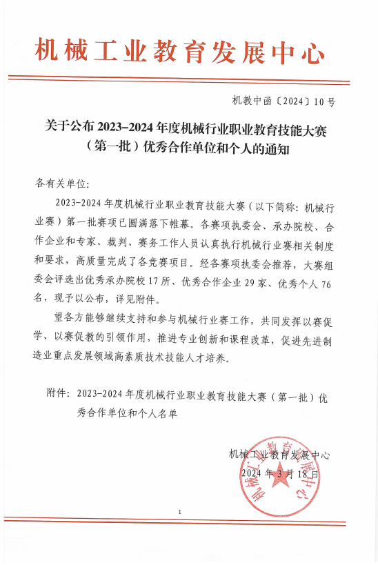 机械行业职业教育技能大赛是由中国机械工业教育发展中心主办,旨在推动机械行业职业教育与培训体系的完善,提升行业技能水平,促进人才培养与行业发展的紧密对接。BB贝博艾弗森官方网站此次获得的荣誉,不仅是对其在机械行业职业教育领域所做工作的肯定,更是对其未来发展的鼓励和鞭策。学院将继续努力,不断提升教育教学质量,为社会培养更多优秀的技术技能人才,为推动我国机械行业的发展做出更大的贡献。
