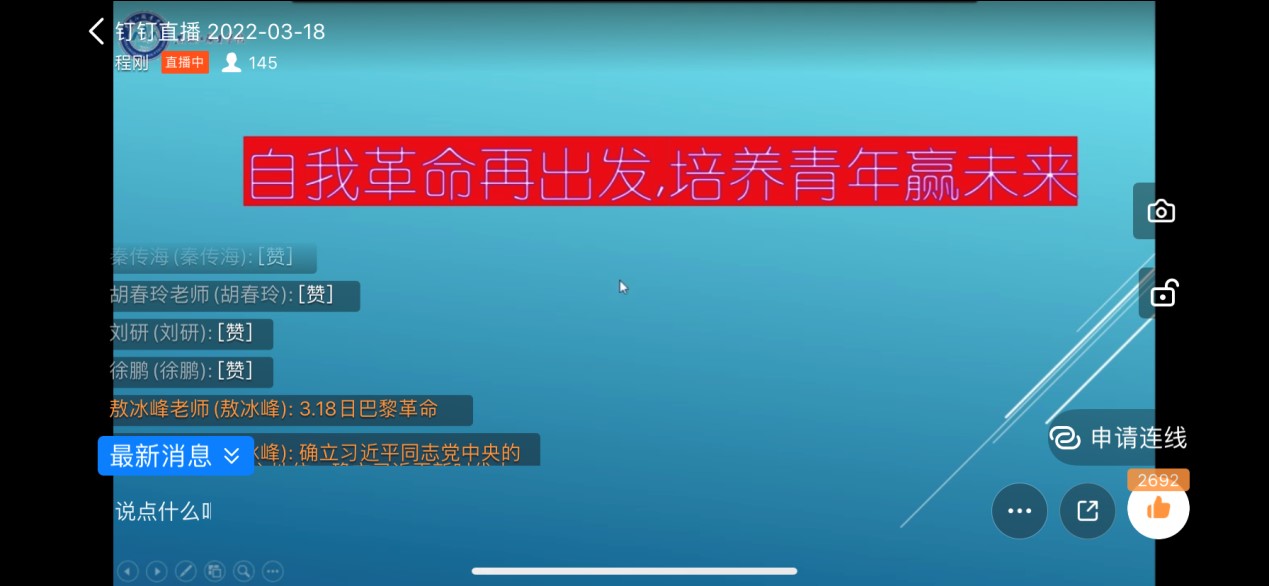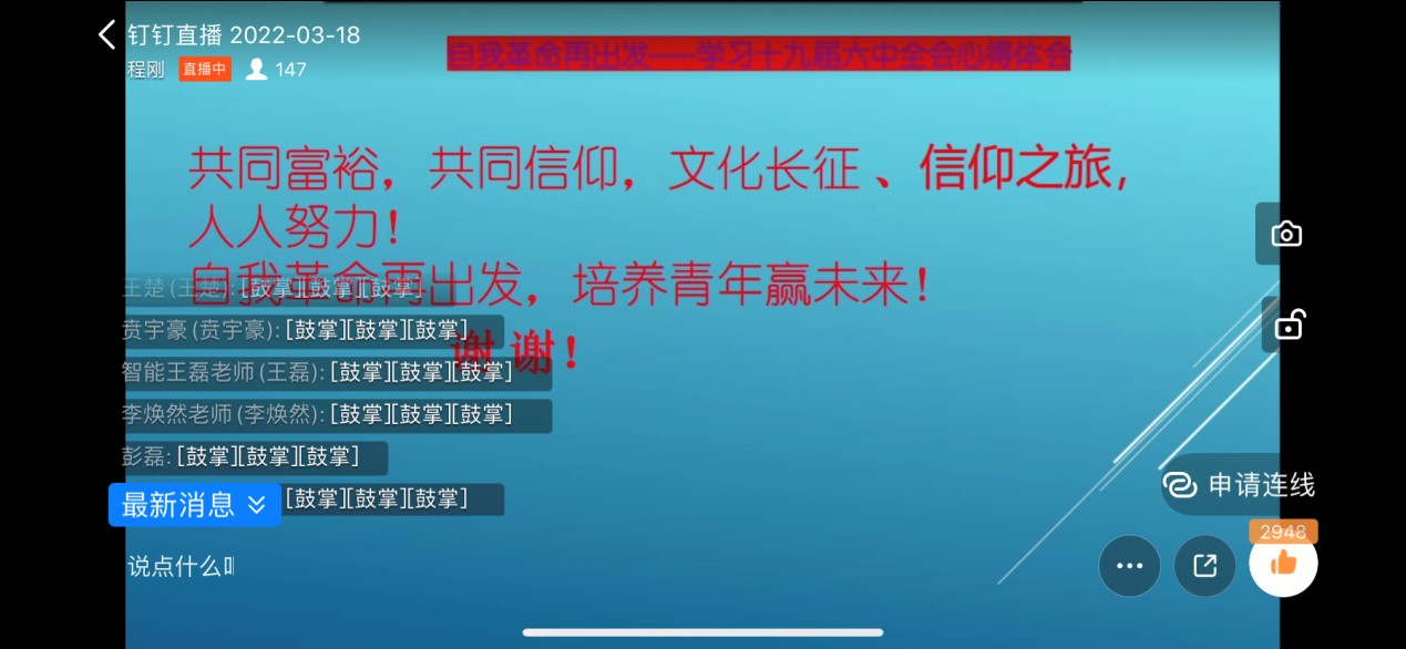 宣讲中,程刚书记从对当前国内外政治局势的分析、两个确立的决定性意义和对青年的培养三方面进行阐述,带领大家深刻领会了党百年奋斗的历史意义及宝贵经验。程刚书记指出,党的十九届六中全会是在我们党成立100周年的重要历史时刻、“两个一百年”奋斗目标交汇的重大历史关头召开的一次重要会议,具有划时代和里程碑意义。这次全会最重要的成果,就是审议通过了《中共中央关于党的百年奋斗重大成就和历史经验的决议》,是一篇马克思主义的纲领性文献,是新时代中国共产党人牢记初心使命、坚持和发展中国特色社会主义的政治宣言书,是以史为鉴、开创未来,实现中华民族伟大复兴的时代动员令。最后,程书记总结,共同富裕,共同信仰,文化长征、信仰之旅,人人努力!自我革命再出发,培养青年营未来。