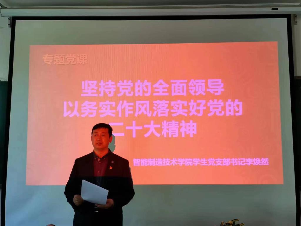 5月10日下午智能制造技术学院学生党支部在工坊楼210教室开展专题党课,支部书记李焕然以《坚持党的全面领导以务实作风落实好党的二十大精神》为题,为支部全体党员上了一堂生动的党课。