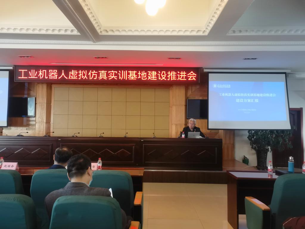 12月14日,学校在经济报告厅召开工业机器人虚拟仿真实训基地建设推进会,学校党委书记赵继会、校长王利文、副校长王明海,教务处长王广文、教务处副处长李立、电气工程学院院长敖冰峰、哈工大国家机器人创新中心有限公司院长刘伟、教授孙博、教授孙思雨以及工业机器人技术教研室全体老师参加会议,会议由王明海校长主持。