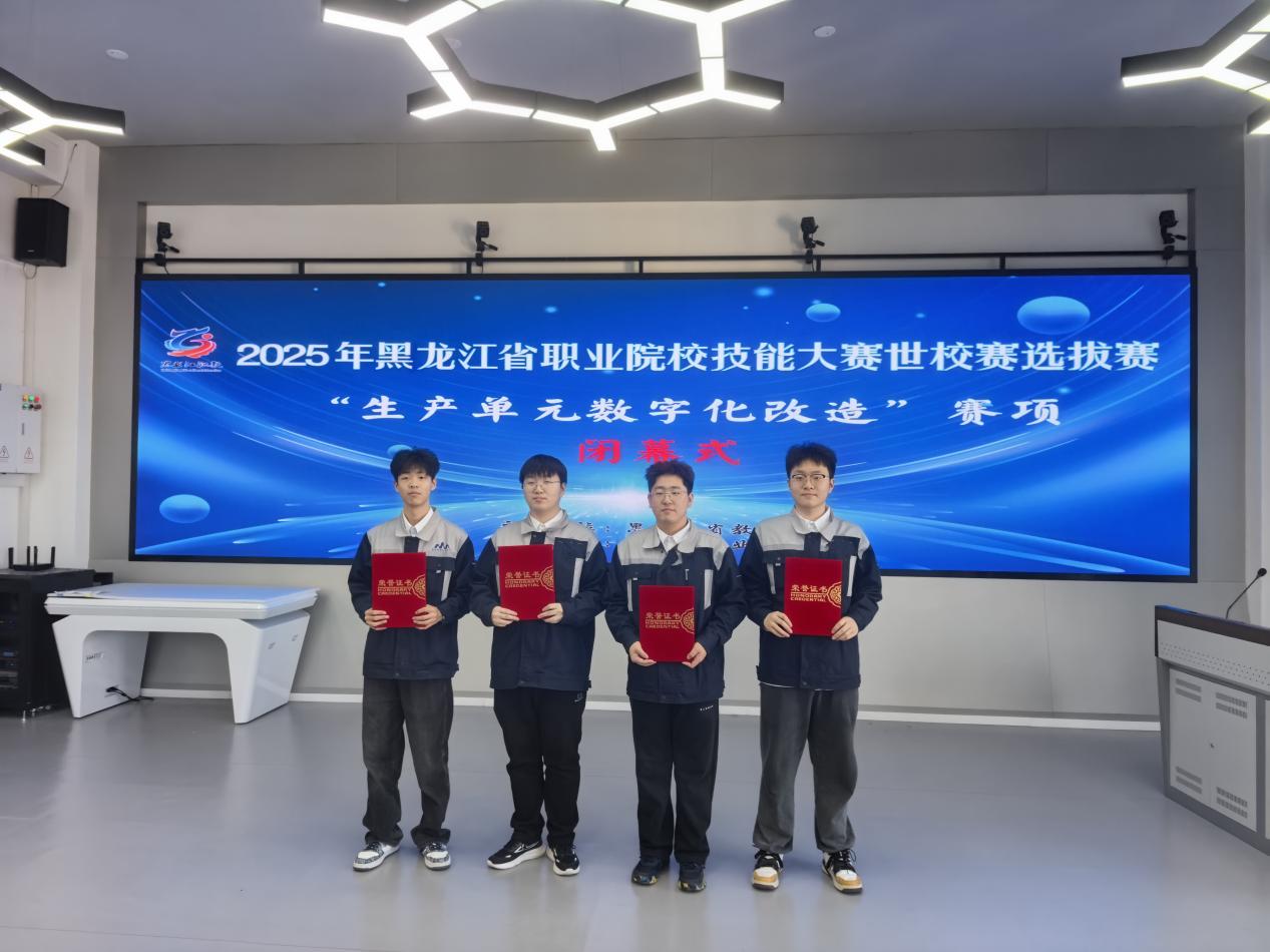 2025年4月26日,由省教育厅主办,BB贝博艾弗森官方网站承办的2025年黑龙江省职业院校技能大赛暨世校赛选拔赛生产单元数字化改造赛项在贝博官网智能制造技术学院举行,来自全省17名选手,参加了比赛。经过激烈的角逐,贝博官网智能制造技术学院教师徐伟、王亿指导的由电气自动化技术专业学生张喜博、任思宇、薛冬冬和孙文组成的团队荣获金奖。