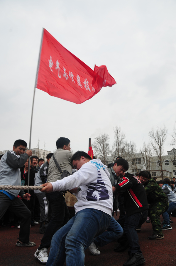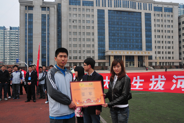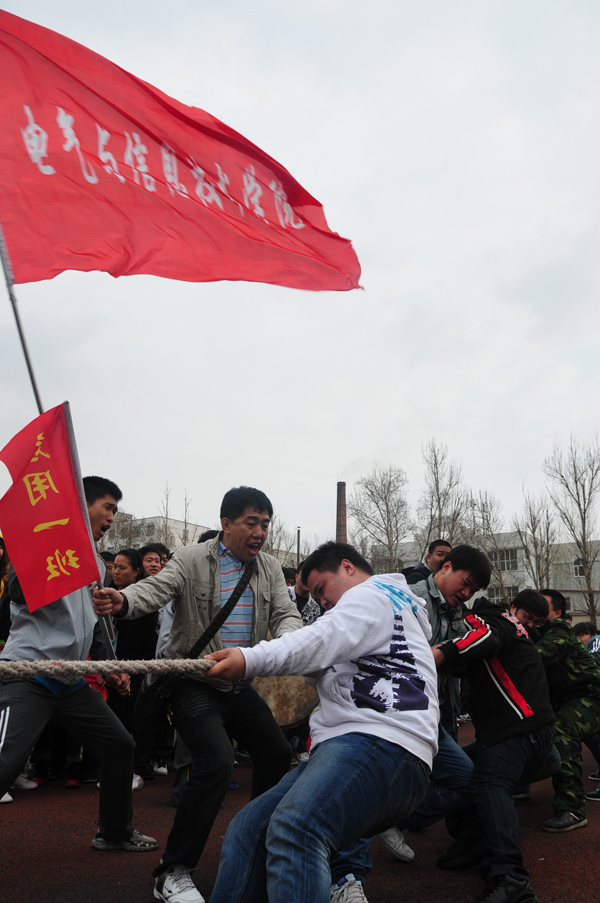 为了丰富学生们的业余生活,发扬团结就是力量的精神。在院党委的领导下,院团委的组织下,决定举办“大力杯”拔河比赛。我分院接到通知后,以谭院长和刘书记为首的领导班子高度重视此次活动。在杜院长为首学管领导班子积极筹备、精心训练和指导.在以李盛博和张超为首的分院学生会密切配合、精心策划和训练.特别是10级全体学生,他们用自己的努力和拼搏赢得了全院师生的赞扬,他们用自己的实际行动鉴证了大学生顽强拼搏的精神。最终在我分院张志勇老师的正确指挥下,同学们的努力拼搏下,我分院取得了此次比赛的亚军,为我分院增光添彩!