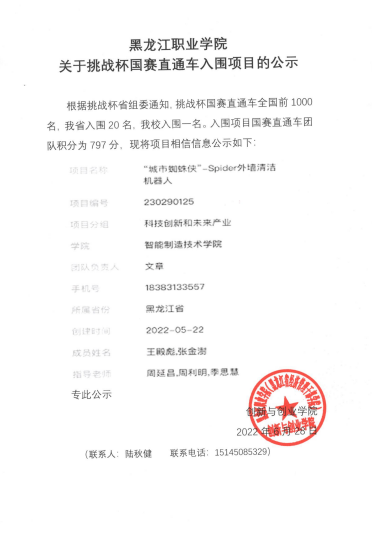 6月28日,根据第十三届工银融e联“挑战杯”黑龙江省大学生创业计划竞赛大赛省组委会通知,贝博官网智能制造技术学院《“城市蜘蛛侠”—spider外墙清洁机器人》项目成功入围国赛直通车全国前1000名,我省共有20个项目入围,贝博官网是全省高职院校中唯一入围项目学校。
