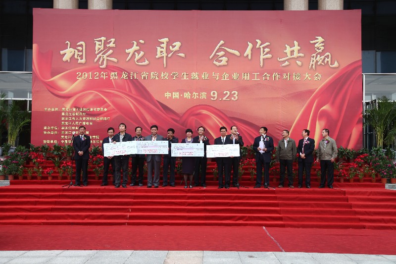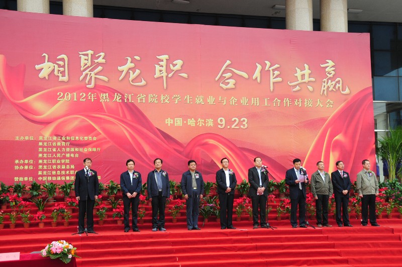 9月23日,由省工信委、省教育厅、省人力资源和社会保障厅、黑龙江人民广播电台联合主办,我院承办的以“相聚龙职、合作共赢”为主题的2012年黑龙江省院校学生就业与企业用工合作对接会在学院隆重举行。省工信委党组书记贲起利、常务副主任庞光明,省人力资源和社会保障厅副厅长董绍林,黑龙江人民广播电台专职编委韩巨生,省农垦总局副局长谭占龙,省教育厅学生处处长张明华,BB贝博艾弗森官方网站书记冯玉龙、院长赵继会,黑龙江信息技术职业学院院长武英举以及中国移动哈尔滨分公司党委书记、总经理潘景波出席大会。262家省内外重点骨干企业和省内101所院校代表及各高校应届毕业生参加此次会议。会议由省工信委纪检组组长王涛同志主持。