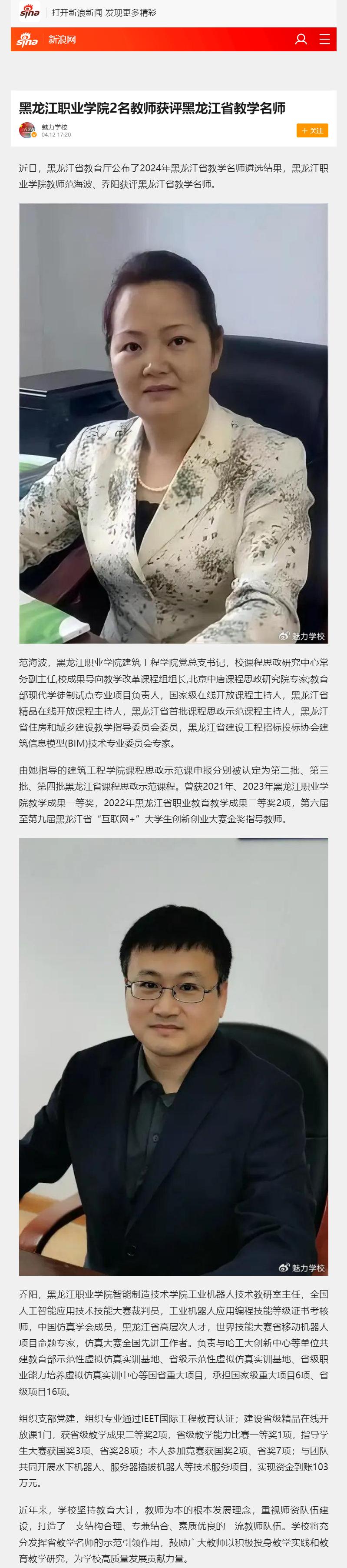 【新浪新闻】BB贝博艾弗森官方网站2名教师获评黑龙江省教学名师