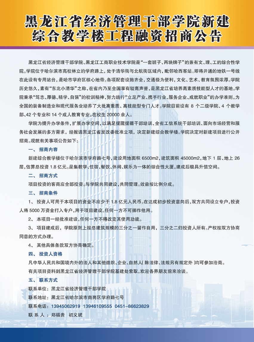 黑龙江省经济管理干部学院新建综合教学楼工程融资招商公告