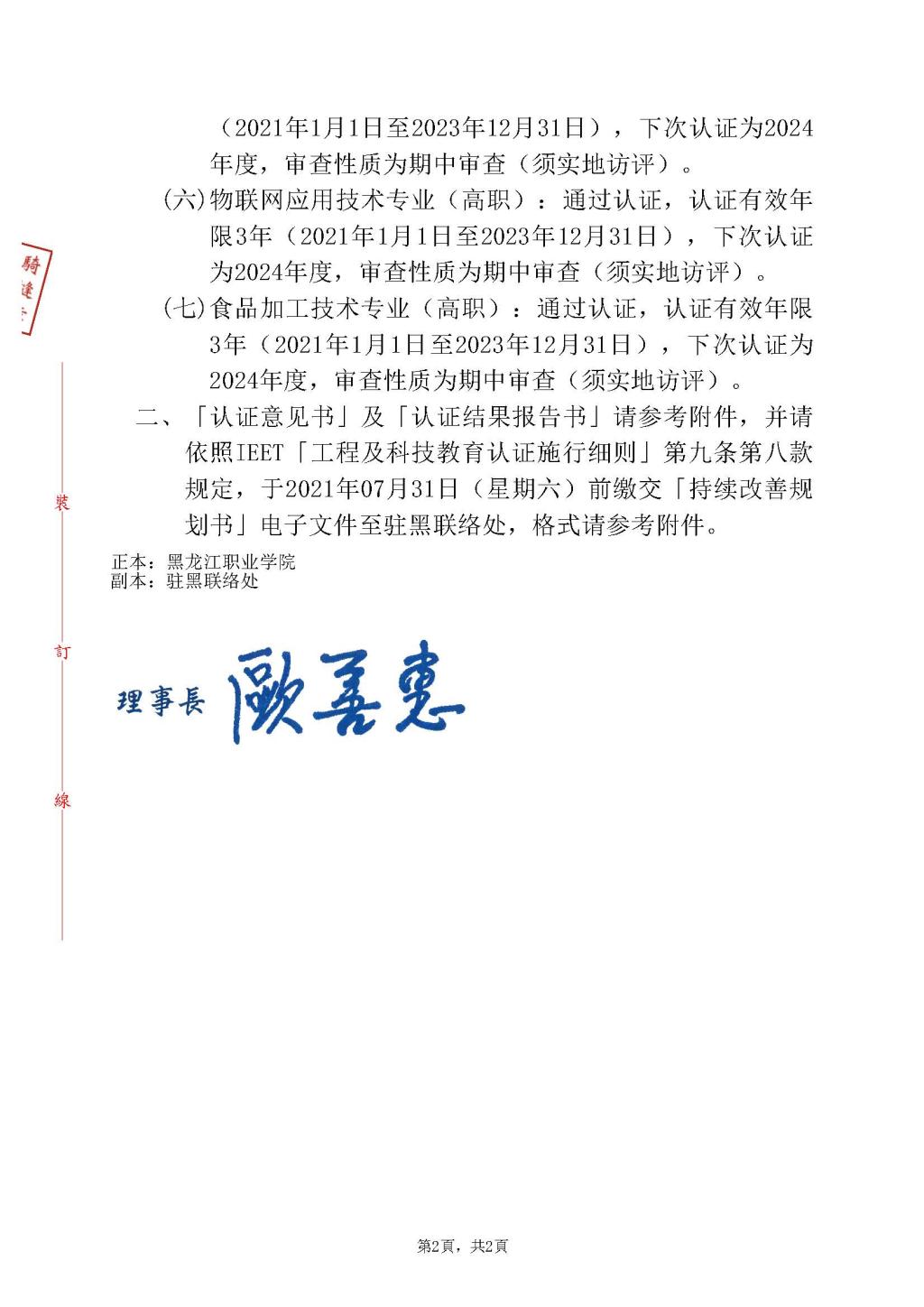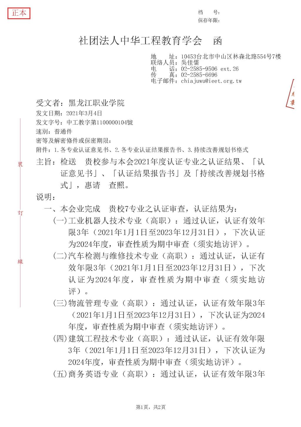 新学期开学传来好消息,根据中华工程教育学会(IEET)认证委员会2021年3月4日公布,贝博官网2021年接受认证的工业机器人技术、汽车检测与维修技术、物流管理、建筑工程技术、商务英语专业、物联网应用技术、食品加工技术专业等7个专业全部顺利通过认证。至此,加上之前通过认证的数控技术、计算机网络技术、电气自动化技术、建筑装饰工程技术和药品生产技术等5个专业,贝博官网已经有12个专业通过IEET工程教育认证,是黑龙江省通过国际工程教育认证专业数量最多的高职院校。