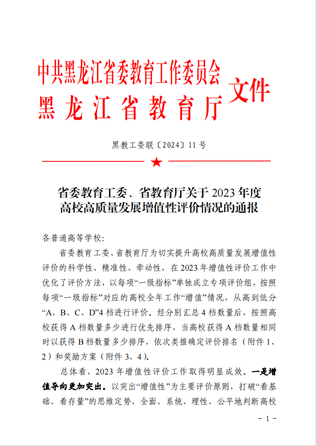 2023年度全省高校高质量发展增值性评价工作,由省委教育工委、省教育厅组织实施,评价主要包括高校党的领导和党的建设、人才培养、科学研究、服务振兴发展、教师队伍、开放办学、学校治理、校园安全、正风肃纪、能力作风、建设特色工作等方面内容。按照每项“一级指标”对应的学校全年工作“增值”情况,从高到低分档评价。经全校上下共同努力,贝博官网在省内39所高职高专院校排位中取得第二名的好成绩,并获“创先排行奖”225万元资金奖励。