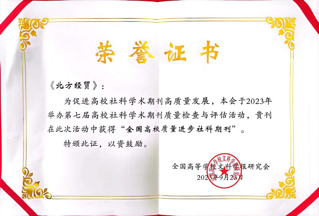 全国高等学校文科学报研究会是教育部主管的学术性、全国性、非营利性的社会组织,国家一级学会,是我国高等学校学术期刊界最为重要的组织机构之一。研究会每四年组织一次全国性的高校社科学术期刊评优活动,综合考量期刊的政治标准、学术水平、社会影响、编辑质量、出版质量等五项指标,全国参评社科期刊一千多家。《北方经贸》获评“全国高校质量进步社科期刊”是学术界、期刊界对贝博官网办刊质量的充分肯定,也是当前学校高质量建设的又一项重要成果,对进一步打造学术期刊精品、推进学术创新、扩大学术影响力具有重要意义。《北方经贸》全体编辑将以此为契机,以更高的标准和更好的质量,继续为学校学科建设、地方发展和学术界繁荣作出贡献。