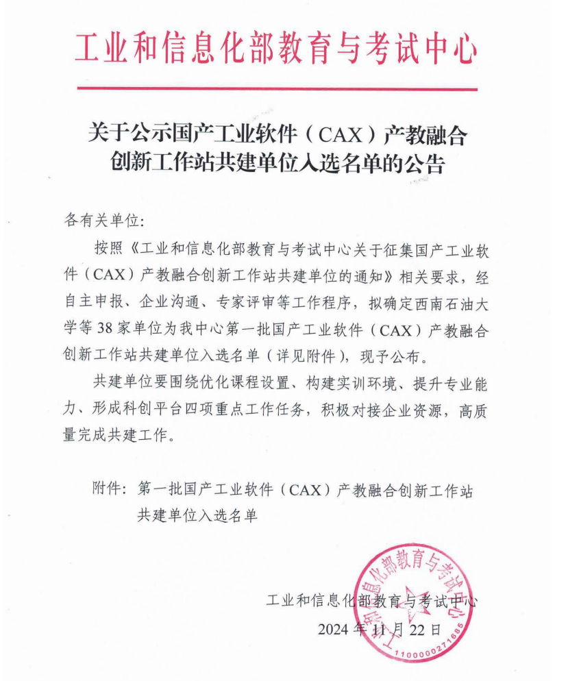 11月25日,工业和信息化部教育与考试中心发布“关于公示国产工业软件(cax)产教融合创新工作站共建单位入选名单的公告”。按照《工业和信息化部教育与考试中心关于征集国产工业软件 (CAX))产教融合创新工作站共建单位的通知》相关要求,经自主申报、企业沟通、专家评审等工作程序,贝博官网及其他37家单位为第一批国产工业软件(CAX) 产教融合创新工作站共建单位入选名单,其中高职院校共33所。
