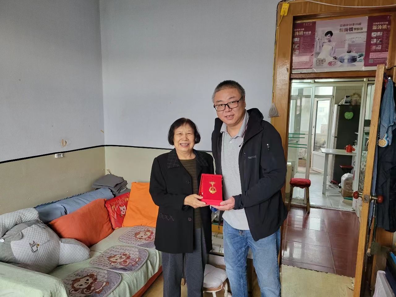 ▲离退休人员工作处党总支副书记杜爽为退休老党员齐秀珍颁发“光荣在党50年”纪念章