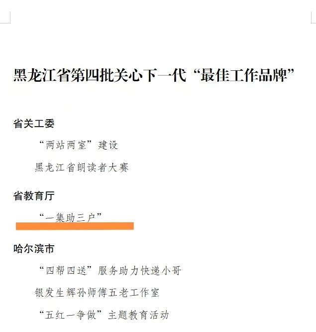 近日,黑龙江省第四批关心下一代“最佳工作品牌”评选结果公布,由省教育厅关心下一代工作委员会(以下简称“关工委”)唯一推送的,以贝博官网关工委“一集助三户”为典型案例的关工品牌,被黑龙江省关工委评为“最佳工作品牌”。
