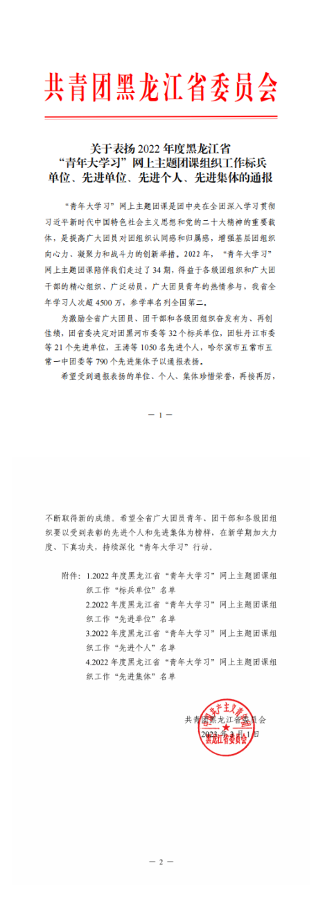 近日,由共青团黑龙江省委员会组织开展的2022年度黑龙江省“青年大学习”网上主题团课组织工作评选结果已公布,贝博官网取得优异成绩。