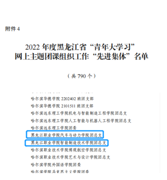 BB贝博艾弗森官方网站汽车与动力学院团总支,BB贝博艾弗森官方网站智能制造技术学院团总支荣获2022 年度黑龙江省“青年大学习”网上主题团课组织工作“先进集体”称号。