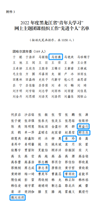 BB贝博艾弗森官方网站汽车与动力学院团总支书记唐志勇、BB贝博艾弗森官方网站智能制造技术学院团总支书记姜玲、BB贝博艾弗森官方网站汽车与动力学院团总支学生副书记郝志丛、BB贝博艾弗森官方网站智能制造技术学院团总支学生副书记周益行、校团委干事马雨薇、校团委学生副书记常雨欣、校学生团工委宣传部部长魏刘欣然,荣获2022 年度黑龙江省“青年大学习”网上主题团课组织工作“先进个人”称号。