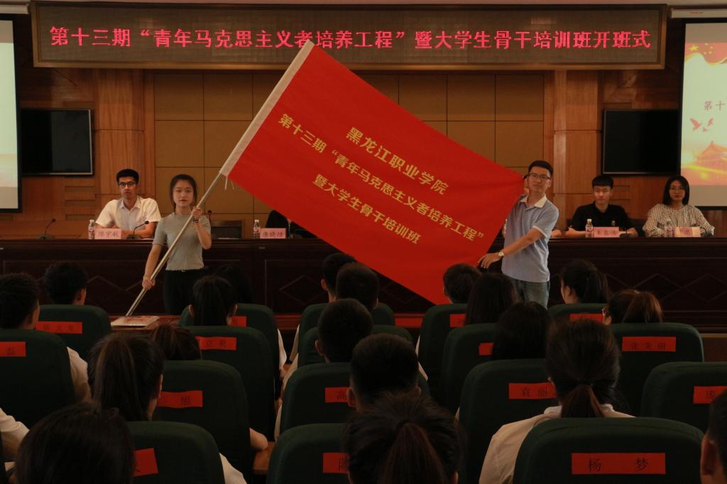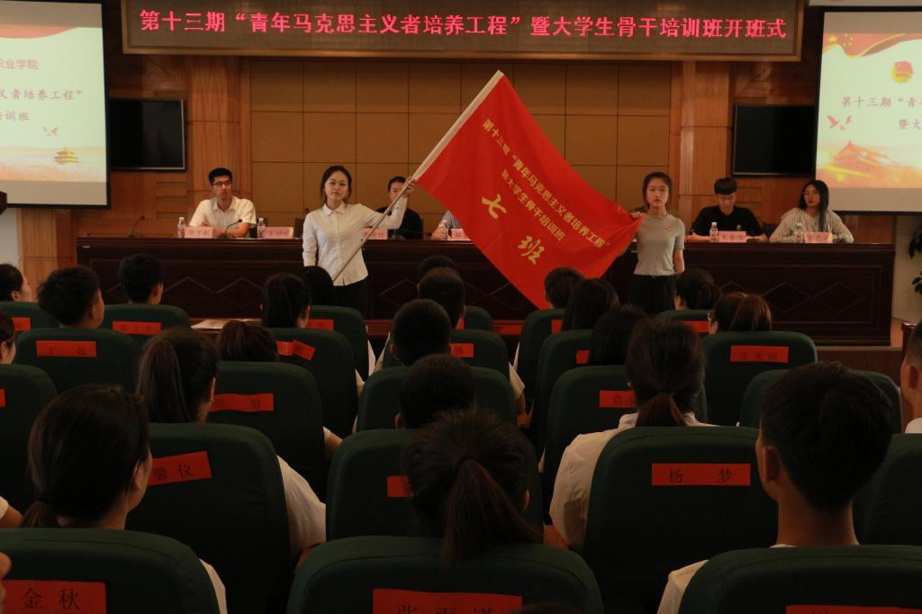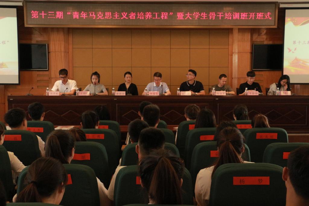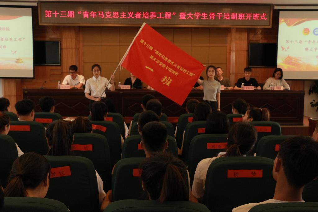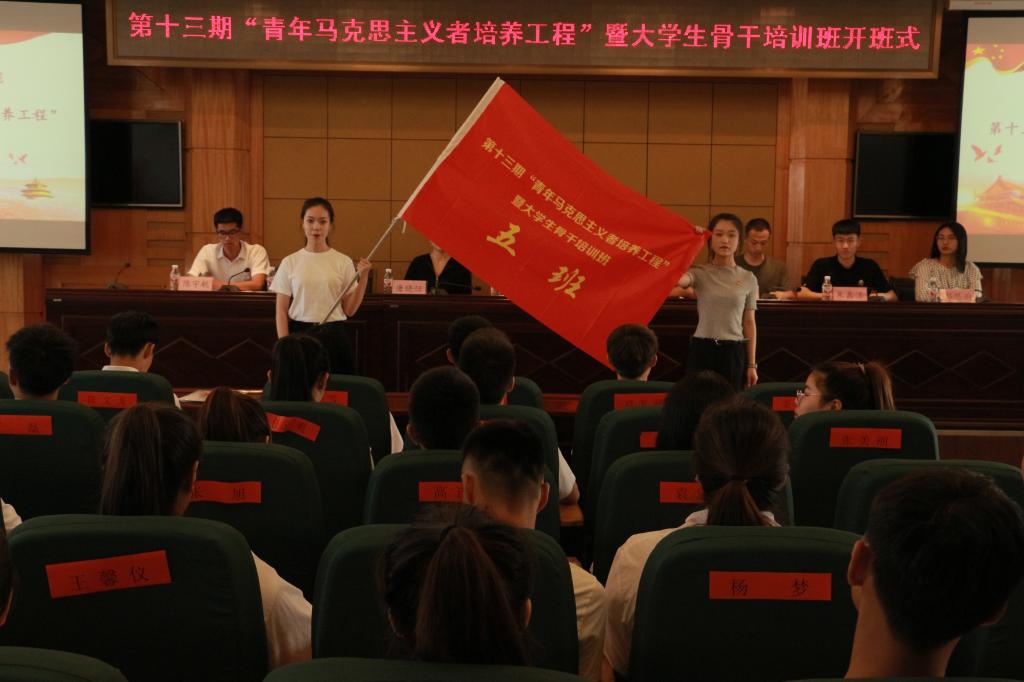 会上,杜超宣读《关于举办第十三期“青年马克思主义者培养工程”暨大学生骨干培训班的通知》;唐晓恬宣读《培训班学员管理规定》;培训班班长、校学生会主席张昊睿代表学员作大会发言,并带领全体学员进行入职宣誓;邹春雷向培训班班主任王婷婷授予培训班班旗;王婷婷向八个小班班长分别授予小班旗。开班式过后,邹春雷为培训班学员作题为《青春心向党,建功新时代》的第一讲。