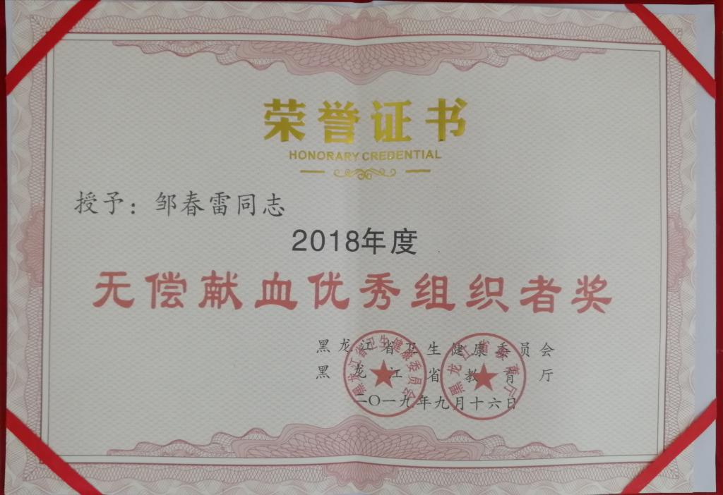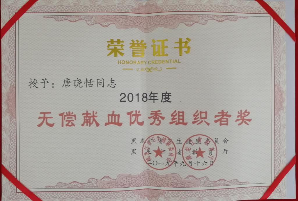 近日,省卫生计生委、省教育厅联合发文,表彰我省中高等学校2018年度无偿献血工作先进单位和个人,贝博官网荣获“无偿献血先进单位奖”;校团委书记邹春雷、组宣办主任唐晓恬分别荣获“无偿献血优秀组织者奖”。