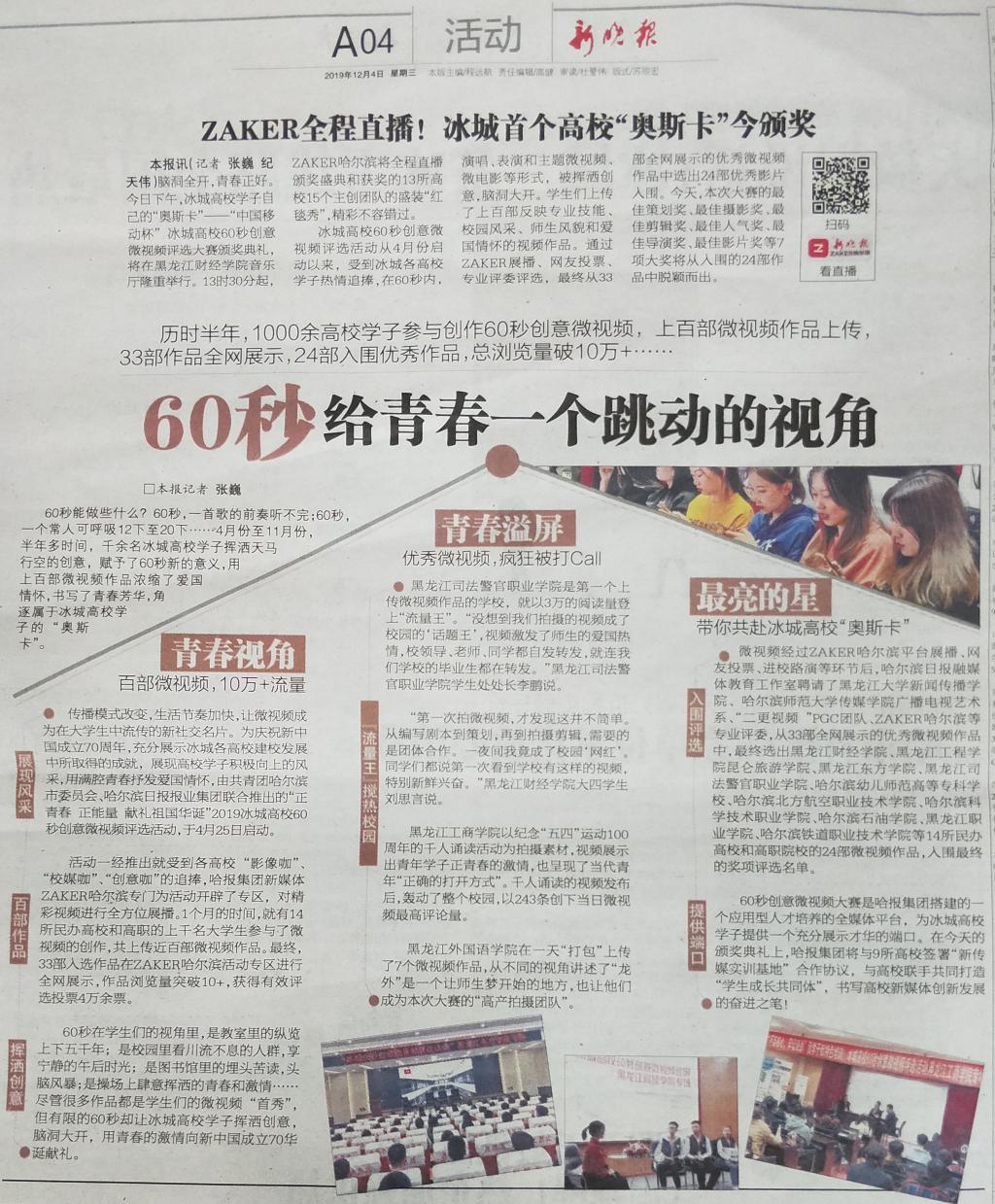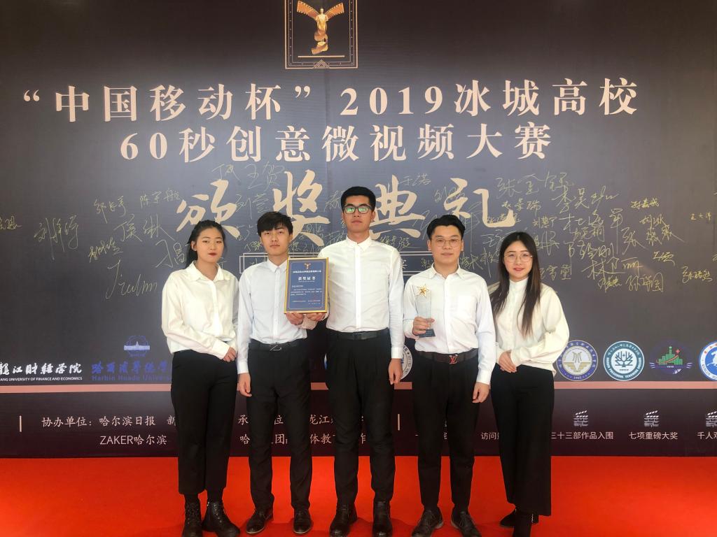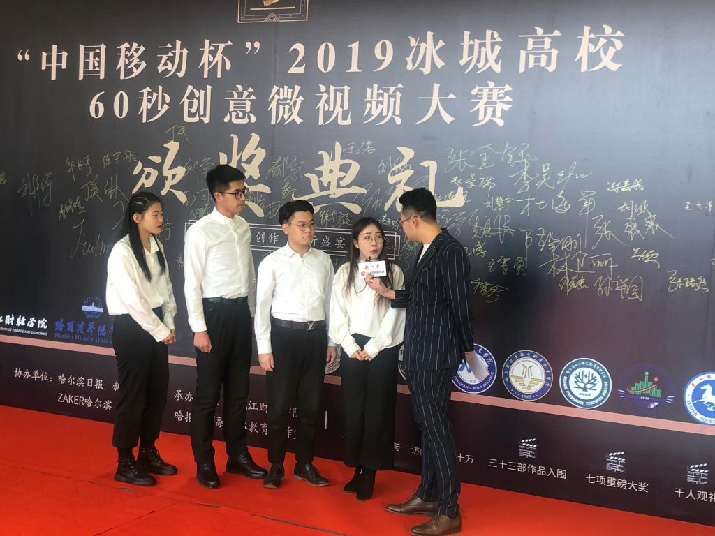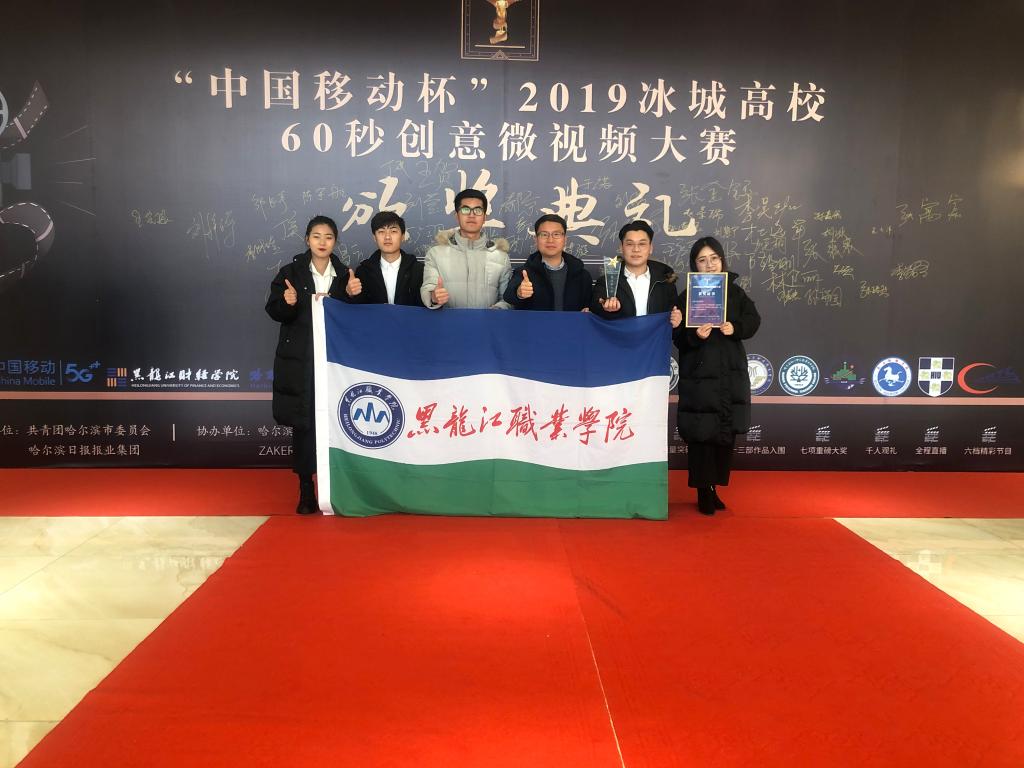 12月4日,“中国移动杯”2019冰城高校60秒创意微视频大赛颁奖典礼隆重举行。大赛由共青团哈尔滨市委员会、黑龙江日报报业集团共同主办,哈尔滨日报、新晚报、ZAKER哈尔滨共同协办,黑龙江财经学院、哈报集团融媒体教育工作室联合承办。由贝博官网大学生新媒体中心袁思强等同学创作的微视频作品《青春龙职,绽放精彩》荣获大赛“优秀影片奖”,贝博官网团委书记邹春雷率主创团队参加颁奖典礼活动。
