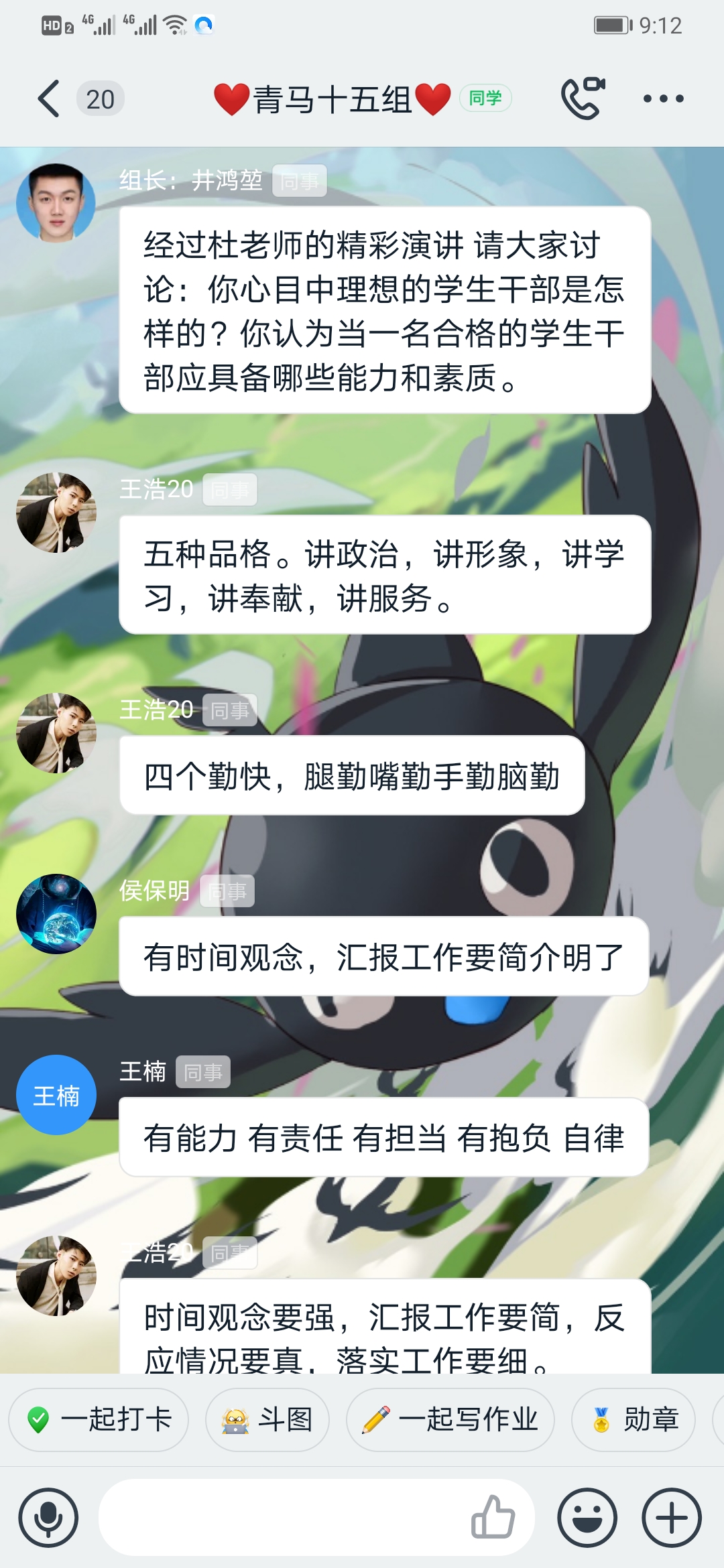 在小组讨论环节,同学们就“你心目中的学生干部是怎么样的?你认为当一名合格的学生干部应具备哪些能力和素质?。”展开充分的讨论。同学们纷纷表示学生干部应品行优良,遇事冷静,恰当处理。以身作则,不计个人得失且对工作要有责任心!