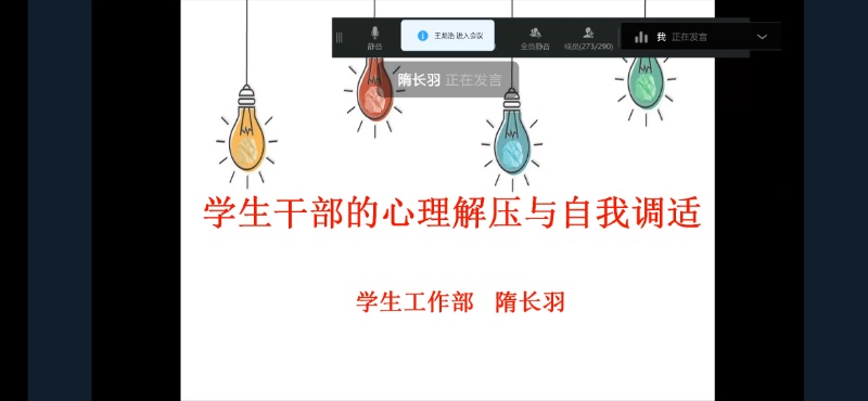 6月17日下午18:00时,第十四期“青年马克思主义者培训工程”暨大学生骨干培训班第五讲在“钉钉”平台上如期进行。本次讲座特邀贝博官网学生工作部心理咨询中心隋长羽老师为同学们作出《学生干部心里解压与自我调节》的专题讲座。298名青马班学员聆听了本次讲座。校团委学生副书记刘丽利主持讲座活动。