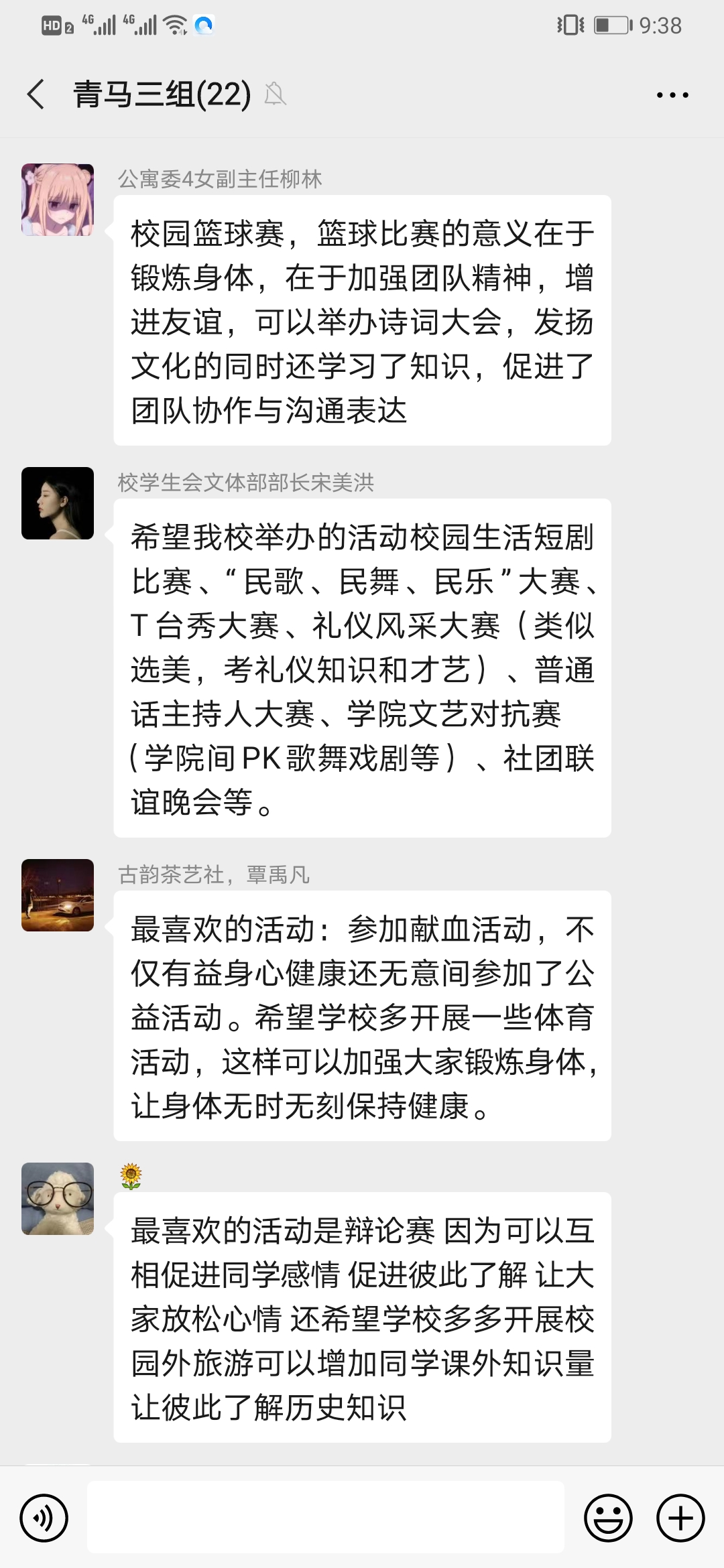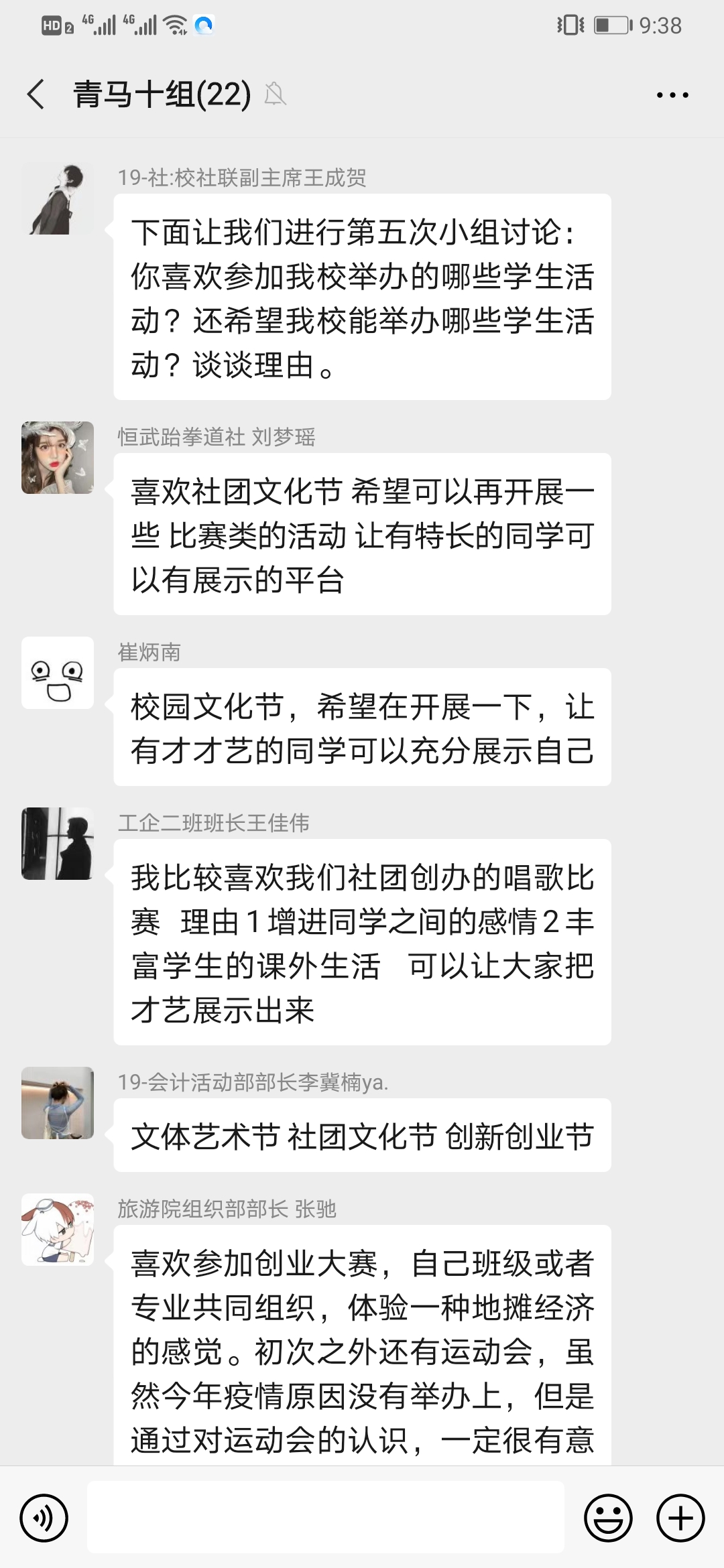在小组讨论环节,同学们就“你喜欢参加贝博官网举办的哪些学生活动?还希望贝博官网能举办哪些学生活动?”展开了充分的讨论,同学们纷纷发言,并解释,学生活动可以锻炼自己、展现自己,也可以建立与人沟通的能力和交往能力,还可以锻炼大家的团队协助能力。