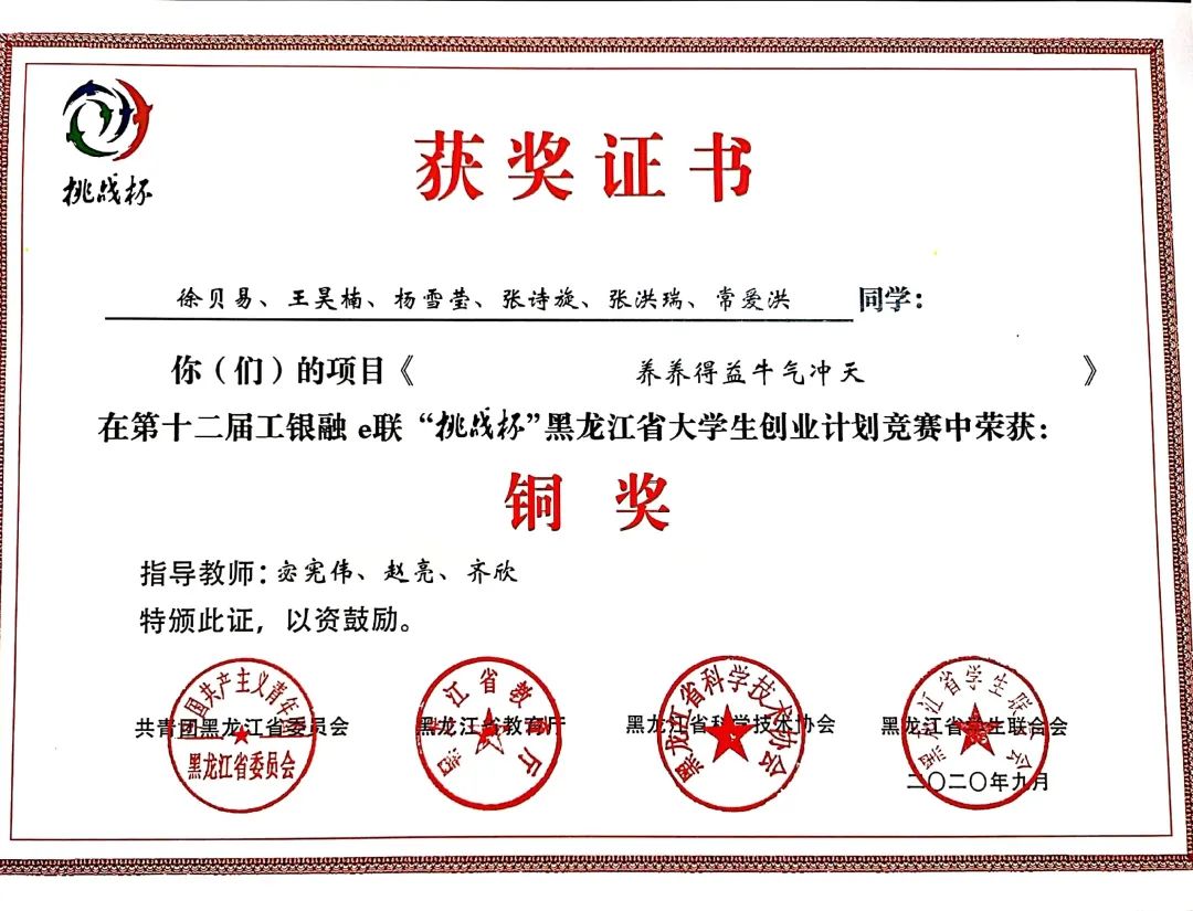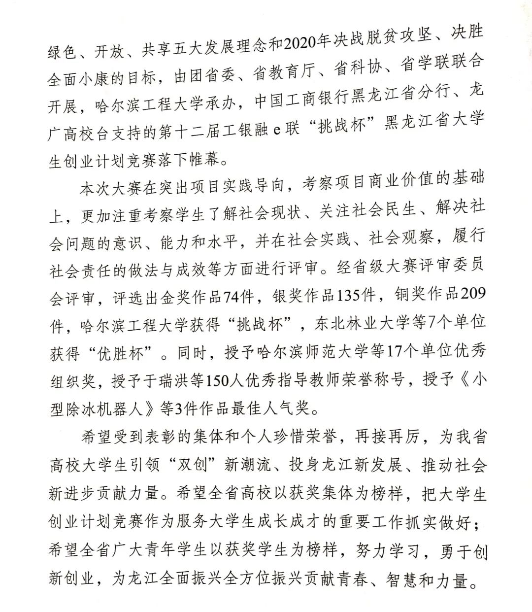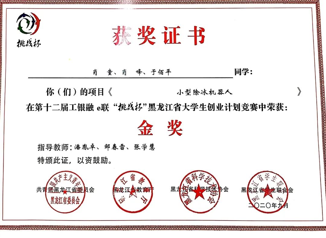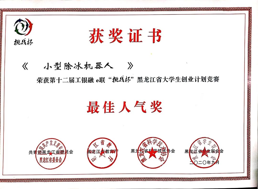 9月8日,团省委、省教育厅、省科学技术协会、省学生联合会联合印发了《关于表彰第十二届工银融e联“挑战杯”黑龙江省大学生创业计划竞赛获奖集体和个人的决定》(黑青联字[2020]13号)文件,贝博官网参赛项目荣获大赛金奖四项、银奖二项、铜奖三项,有三项作品被推荐至国赛,由机械工程学院教师潘胤卓指导,学生肖童负责的《小型除冰机器人》项目以总票数排名第一的成绩荣获“最佳人气奖”,贝博官网荣膺大赛“优胜杯”,创造了贝博官网“挑战杯”参赛史最佳成绩。