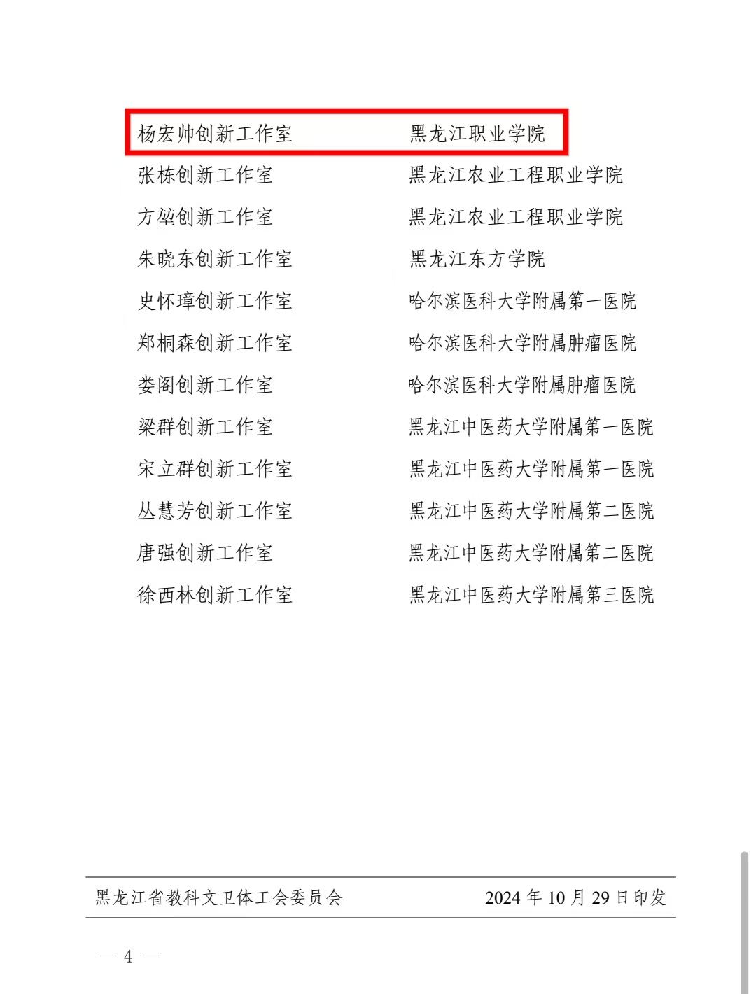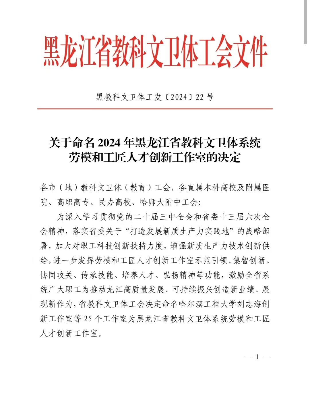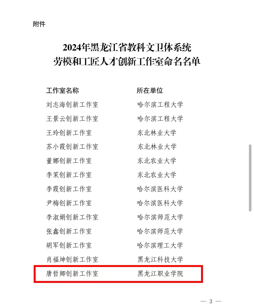近日,省教科文卫体工会下发《关于命名2024年黑龙江省教科文卫体系统劳模和工匠人才创新工作室的决定》,全省共25个工作室获评省教科文卫体系统劳模和工匠人才创新工作室,贝博官网唐哲卿创新工作室、杨宏帅创新工作室获此殊荣。
