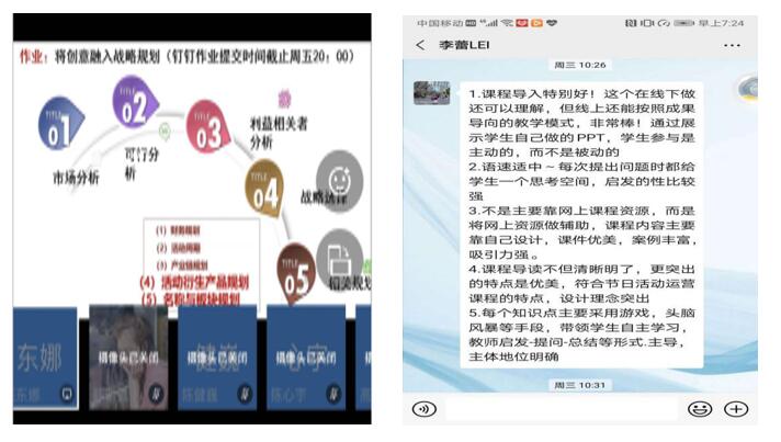 为贯彻疫情期间“停课不停学”“线上保质量”的要求,各方都在积极探索网课教学的新方式,为做好这次线上开放课工作,校级督导郭艳坤、李蕾多次进入课堂听课,与主讲教师研究课程设计,对授课环节、时间分配、网络平台等进行详细的交流与建议,质量监控中心袁晓初经常过问准备情况,帮助解决授课二维码等问题,范贞主动承担助教角色。张东娜勇于担当,全心投入,课前通过国家会展策划与管理专业资源库微知库教学平台提供教学视频、授课指南等学习材料,供学生预习和把握课上学习要点。课中采用钉钉直播为主,突出以学生为中心,采取问题导向、学生视频任务展示、师生共评、PPT图片展示等方式组织教学,内容涵盖教材精读文本、图文案例、微课视频、音频介绍、新闻展示等。通过课堂研讨、点答式提问时时关注学生学习状态,带领学生自主学习,不断激发学生的学习热情,保证了学生全员全程参与并有效达成学习目标。课后通过布置作业、师生研讨和答疑辅导等巩固学生学习成果。