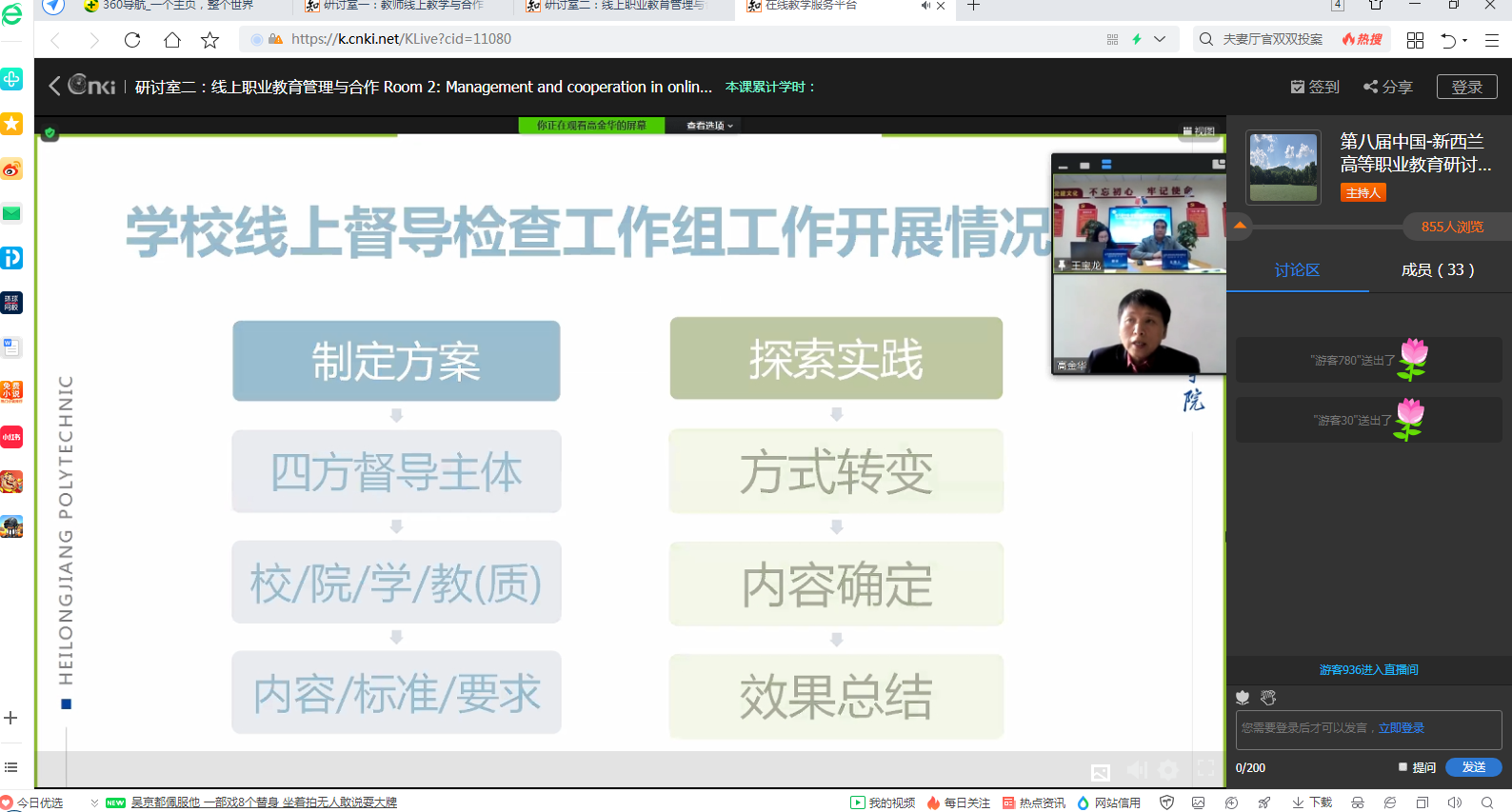 本次会议采取线上线下同声传译的方式,以“线上学习与教学:挑战·发现·创新”为主题,分设“教师线上教学与合作、线上职业教育管理与合作、职业教育线上教育教学研究”三个研讨室,每个研讨室遴选中、外教育教学专家各两人进行主旨报告。高金华作为中方专家之一在第二研讨室作了以《高职院校“三个三”线上教学质量督导模式探索和实践》为题目的报告,全面分享了贝博官网线上教学质量监控工作实践经验做法,并与参会人员就线上教学质量督导相关问题进行交流研讨互动,认真专注诚恳回答大家现场提出的问题,参会专家及教师对贝博官网线上教学质量监控工作一致认可并给予高度赞誉。