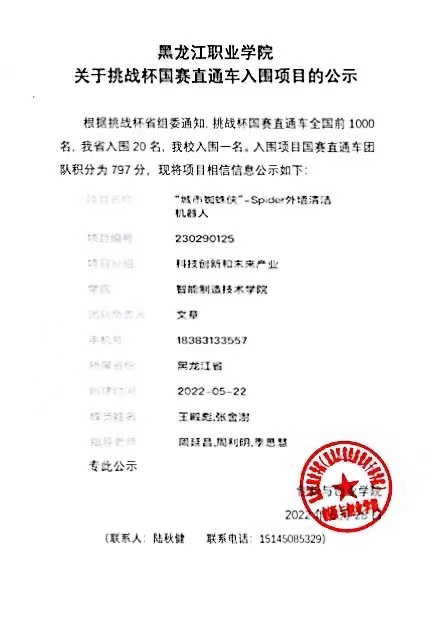 6月28日,根据第十三届工银融e联“挑战杯”黑龙江省大学生创业计划竞赛大赛省组委会通知,贝博官网智能制造技术学院《“城市蜘蛛侠”—spider外墙清洁机器人》项目成功入围国赛直通车全国前1000名,我省共有20个项目入围,贝博官网是全省高职院校中唯一入围项目学校。