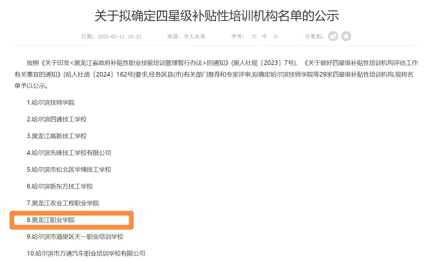 近日,哈尔滨市人力资源和社会保障局公示了《关于拟确定四星级补贴性培训机构名单》,贝博官网成功入选哈尔滨市四星级补贴性培训机构。
