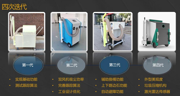 自跟随垃圾清洁车经过三次迭代,具备了稳定的性能,并在贝博官网物业试用后取得良好的效果反馈。第一台样机,只验证了一个基本的跟随算法,比较初级,但基本满足了使用功能。第二台样机,增加了双风机,吸力有了大幅度提升,造型上更加美观,采用了PLC控制,性能更加稳定。第三台样机,增加了上下路边石功能、智能避障功能和一个辅助换桶功能。第四台样机,就是此次参赛的作品,已经进行了工业设计,不仅美观度得到了提升,而且增加了垃圾压缩功能。一次次的更新迭代,最终诞生了这台自跟随垃圾清洁车。