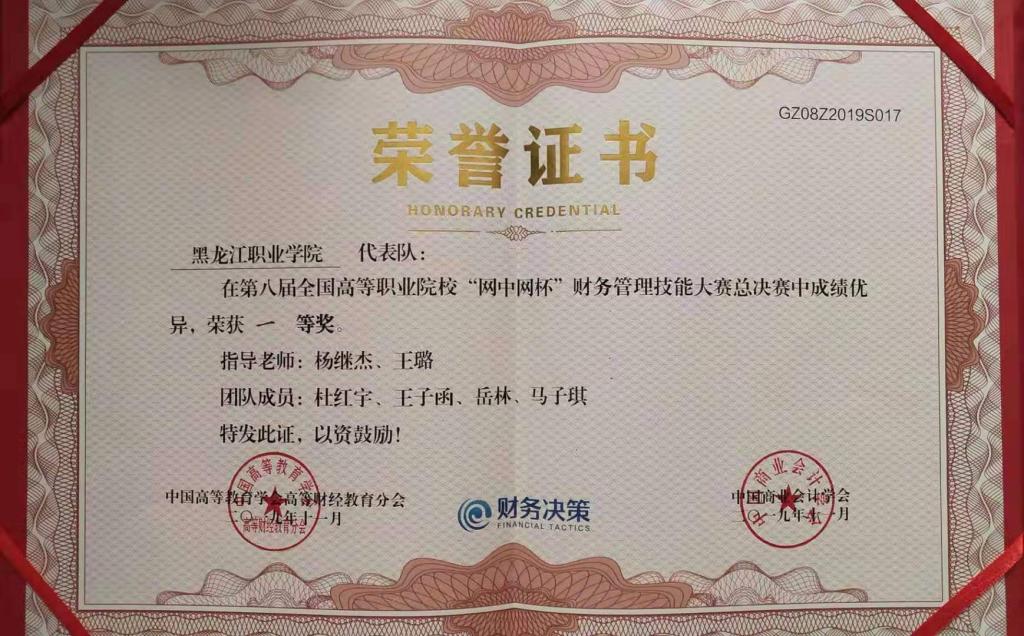 11月2日,在第八届全国高等职业院校“网中网杯”财务管理技能(财务管理决策)全国总决赛中,由会计金融学院教师杨继杰、王璐任指导教师,2018级会计专业学生杜红宇、马子琪、王子函、岳林组成的BB贝博艾弗森官方网站代表队荣获全国一等奖。