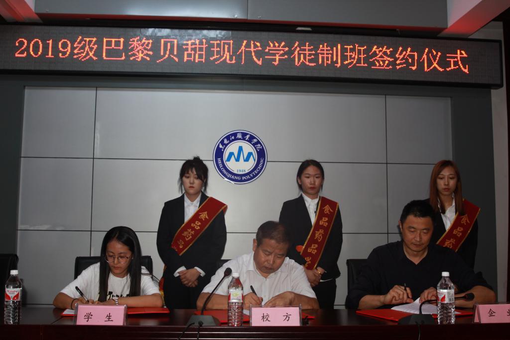 2019级新生入学期间丁原春多次与企业研讨招生招工细节,并亲临新生报到现场,解答学生和家长提出的问题,与企业代表沟通交流,对后续工作开展提出建设性意见和建议。会议期间,王喆代表食品药品学院向2019级新同学的到来的表示祝贺,并向不远千里陪同而来的家长致以问候,王喆代表学院介绍了食品药品学院的总体情况与近年的发展,同时对两家长期合作企业表示感谢,并表示自2016年成立首届巴黎贝甜现代学徒制班以来连续四届成功开班,吉林大药房班已成功举办两届,现今在企业学徒学生大都成长为主任、店长,成为公司的业务骨干,感谢他们在推进校企合作和促进学院学生就业中付出的辛苦与努力,她说学生在公司的发展前景都有目共睹,也表示合作期间校企双方都付出了辛勤的努力,双方也在不断改革创新,为学徒制班深入开展不断探索。企业代表也表示食品药品学院给予了企业大量的支持,企业才能契合与学院现代学徒制合作的发展战略,学生通过在企学徒在毕业前很好地了解企业文化、深入企业实践,为实现零距离就业打下坚实基础。签约仪式随后举行,学生和家长们在大致了解企业和学校情况以后,也纷纷提出关心的问题并进行了咨询,学院参会人员和企业代表也详细回答他们的疑问,同学们都毫不犹豫地在合作协议上签下自己的名字。最后进行了开班仪式,李峰经理和田刚经理分别给2019级食品加工技术、药品经营管理专业现代学徒制班上了开学第一课,通过视频短片、多媒体展示、与学生互动等形式,条理清晰地讲解了学徒制班在校和在企学习方式,用大量实例让学生明白自身如何进行有效学习,实现自身发展。
