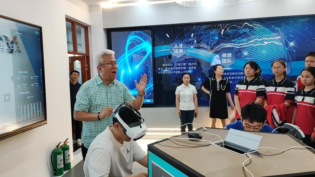 智能制造技术学院党总支书记敖冰峰带队讲解,用充满激情的语言生动形象地介绍了智能制造专精特新产业学院工业机器人虚拟仿真实训基地的先进设备和教学理念,分析智能制造在未来工业发展中的重要性。