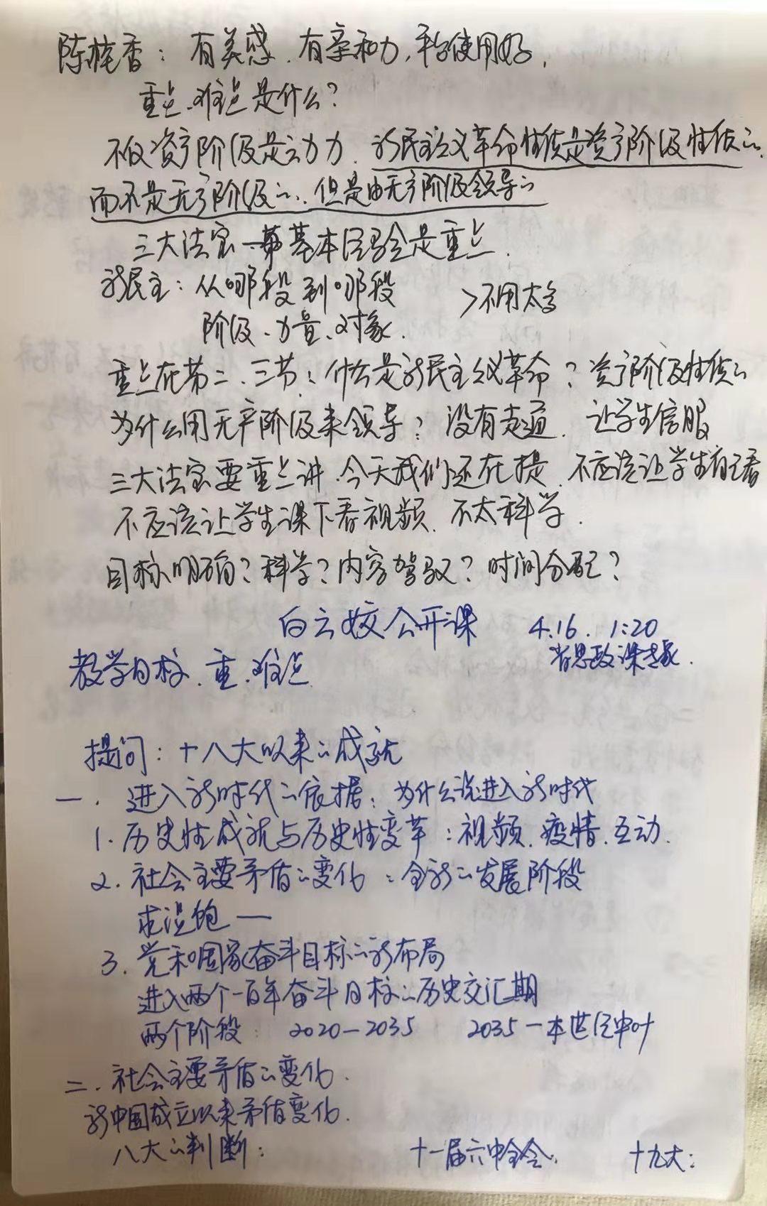 疫情是一次危机,也是一场大考。教师停课不停教,考的是觉悟与初心,考的是能力与水平。为了保证线上教学质量,提升有校难返的学生的获得感,思想政治教研部以案说教,以“六高”态势,以示范教学为切入点,开展集体备课、集体听评课,全面提升教师课堂教学能力水平,收到了良好效果。